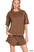 Experience ultimate comfort and style with our Scuba Short Sleeve and Dolphin Shorts Set! The relaxed fit and drawstring elastic waist shorts with side pockets provide convenience and ease. With an inseam of 3.5" for the shorts, you'll stun in both comfort and style.