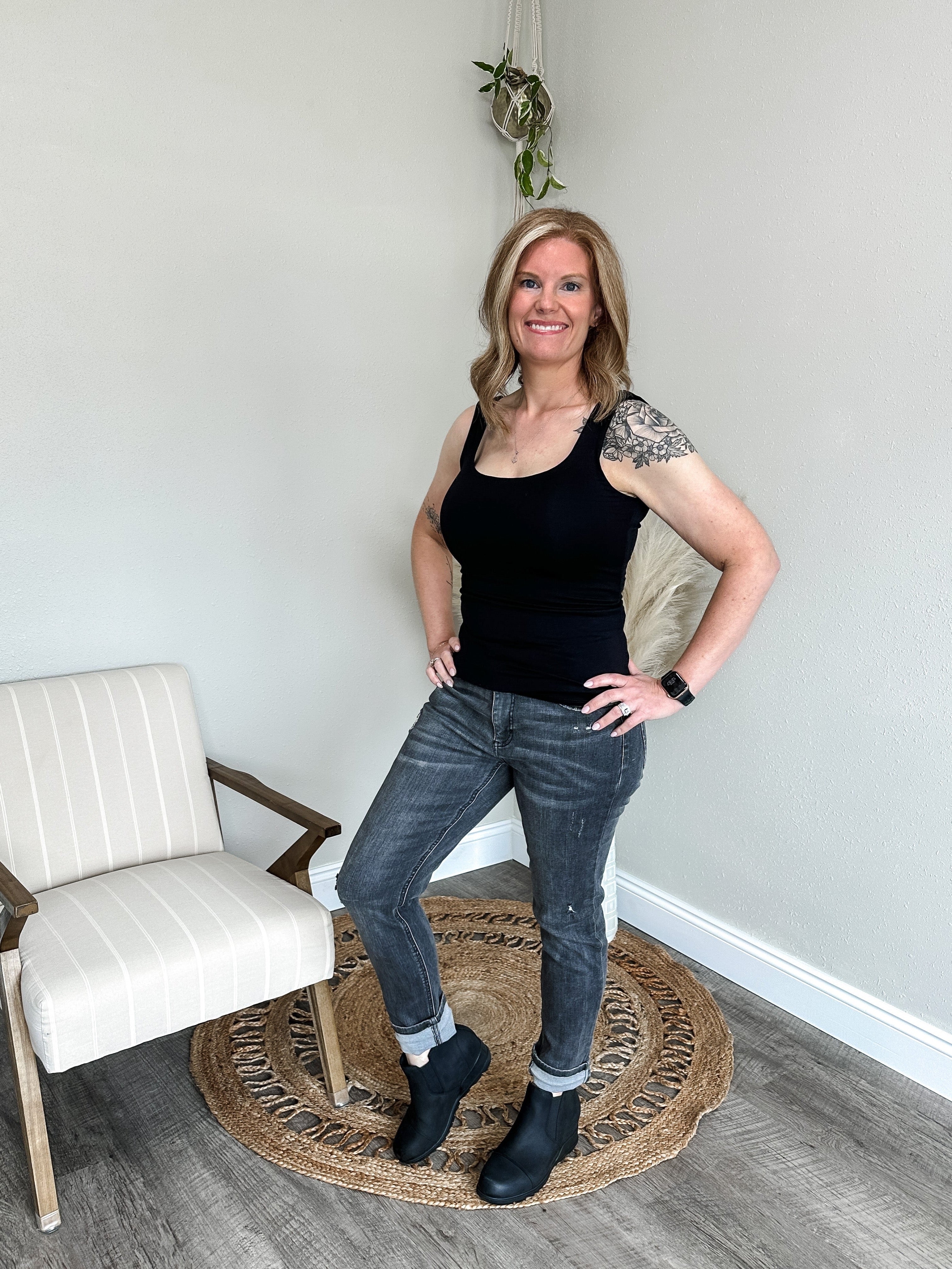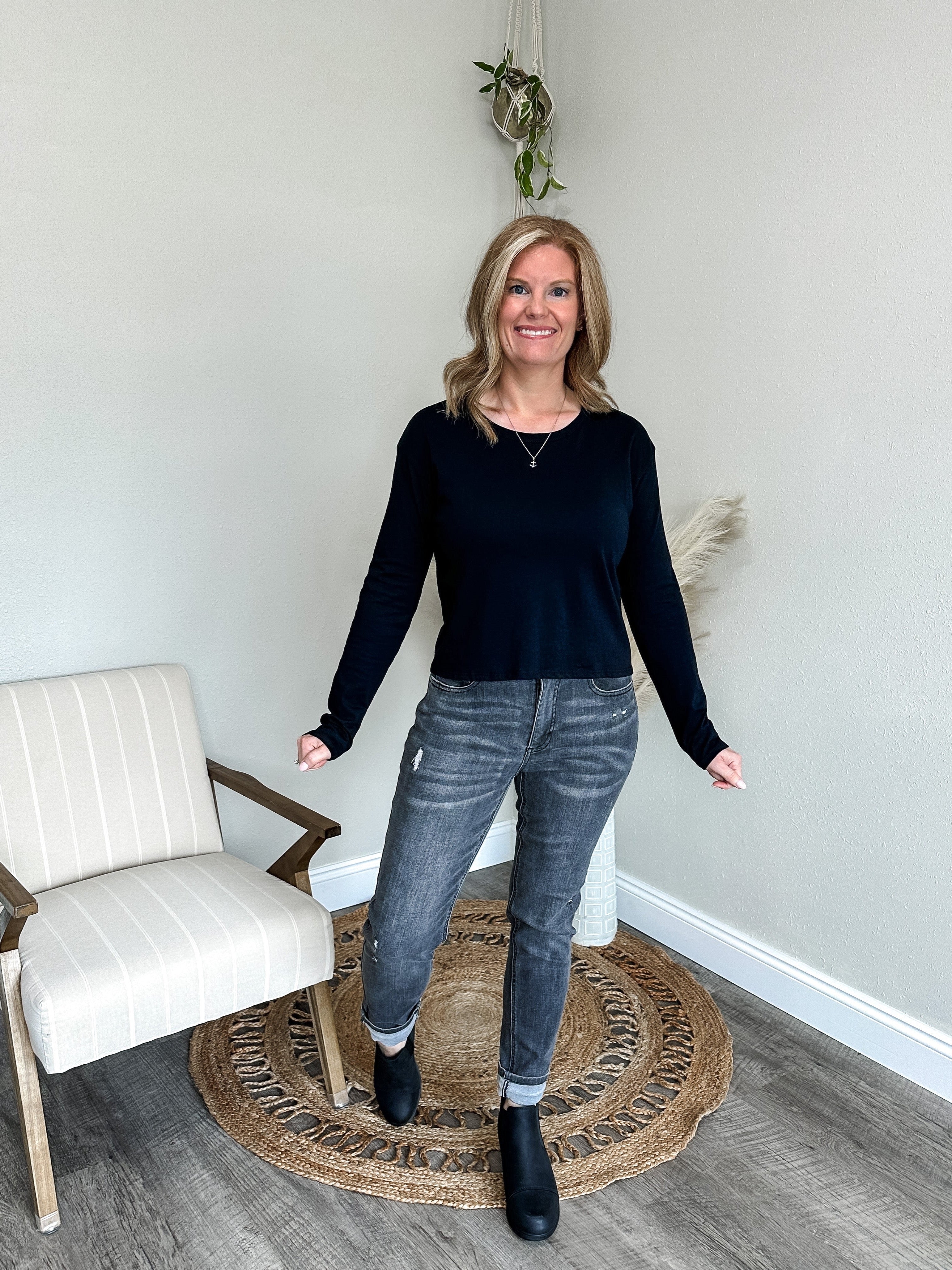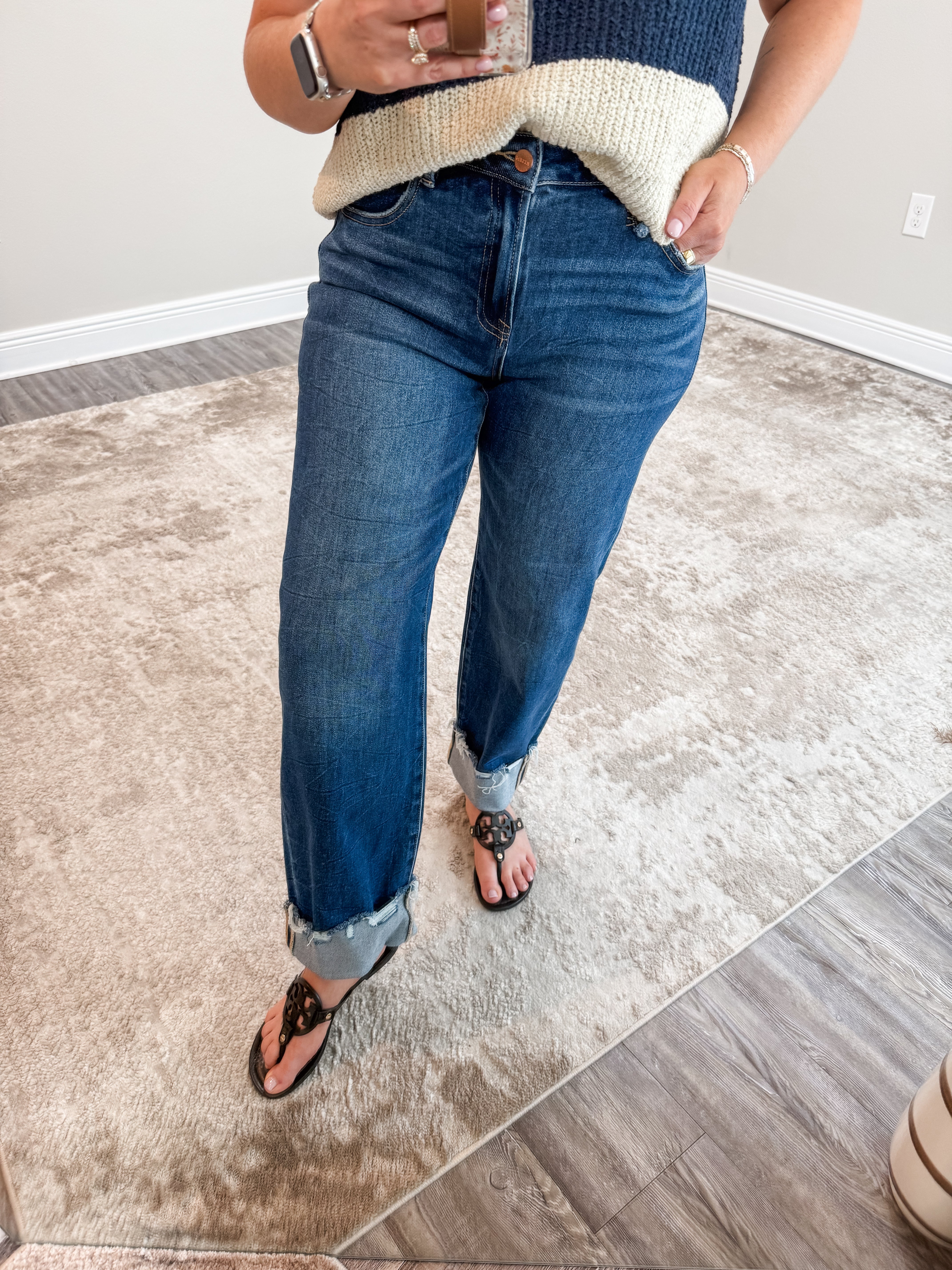 Risen High Rise Crop Boyfriend Cuffed Jeans (Dark Washed)