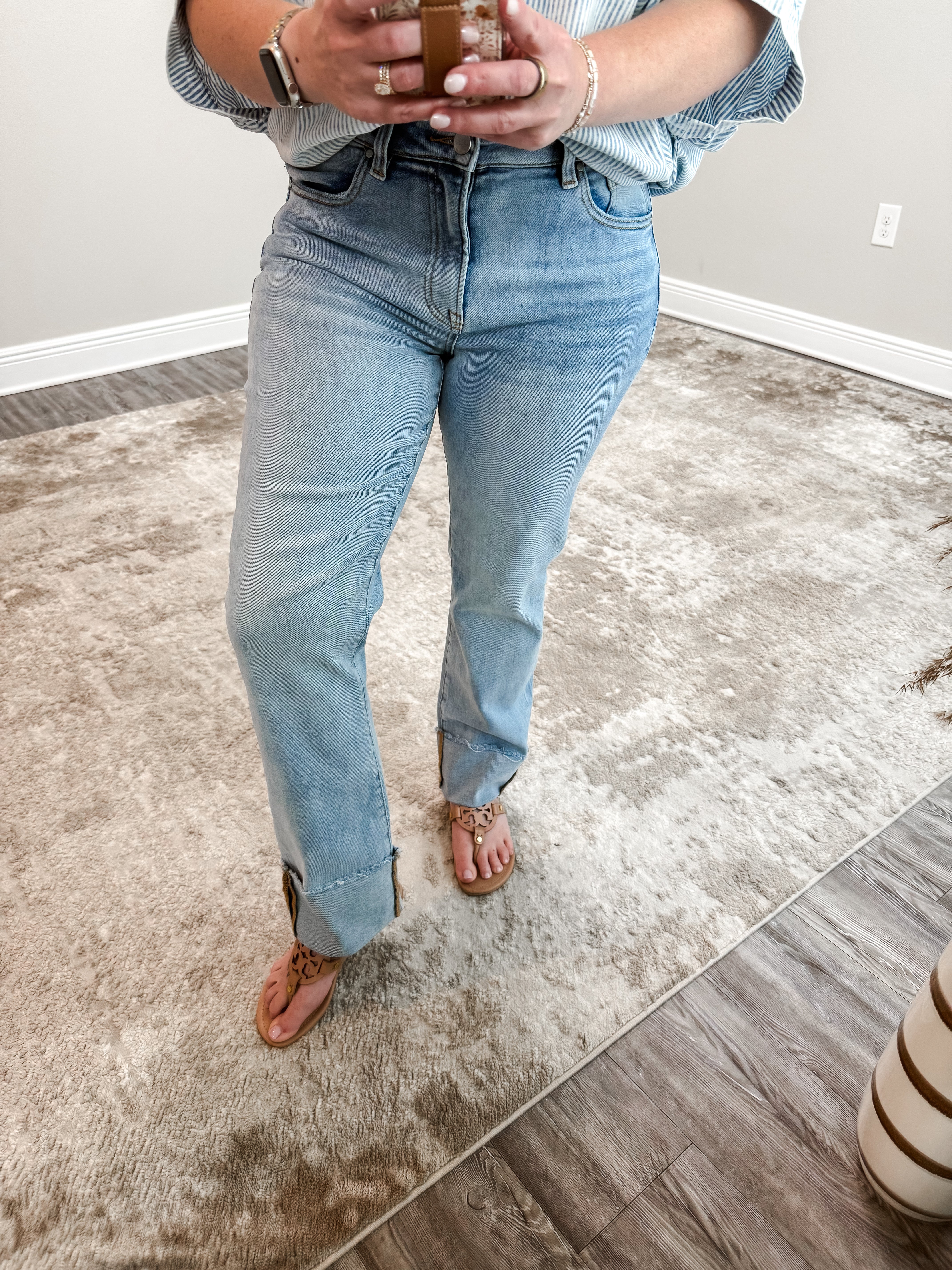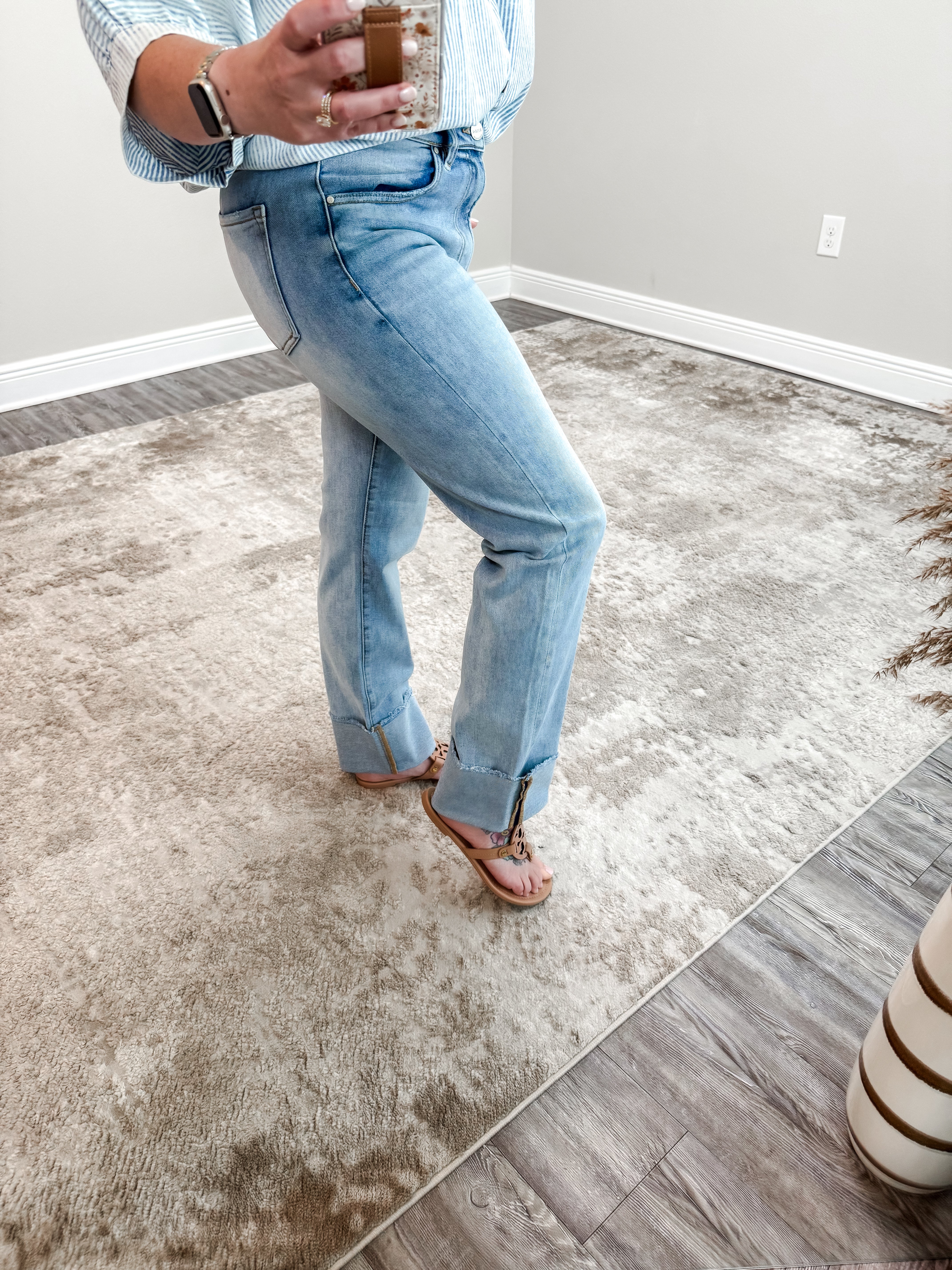 Risen High Rise Crop Boyfriend Cuffed Jeans (Light Washed)