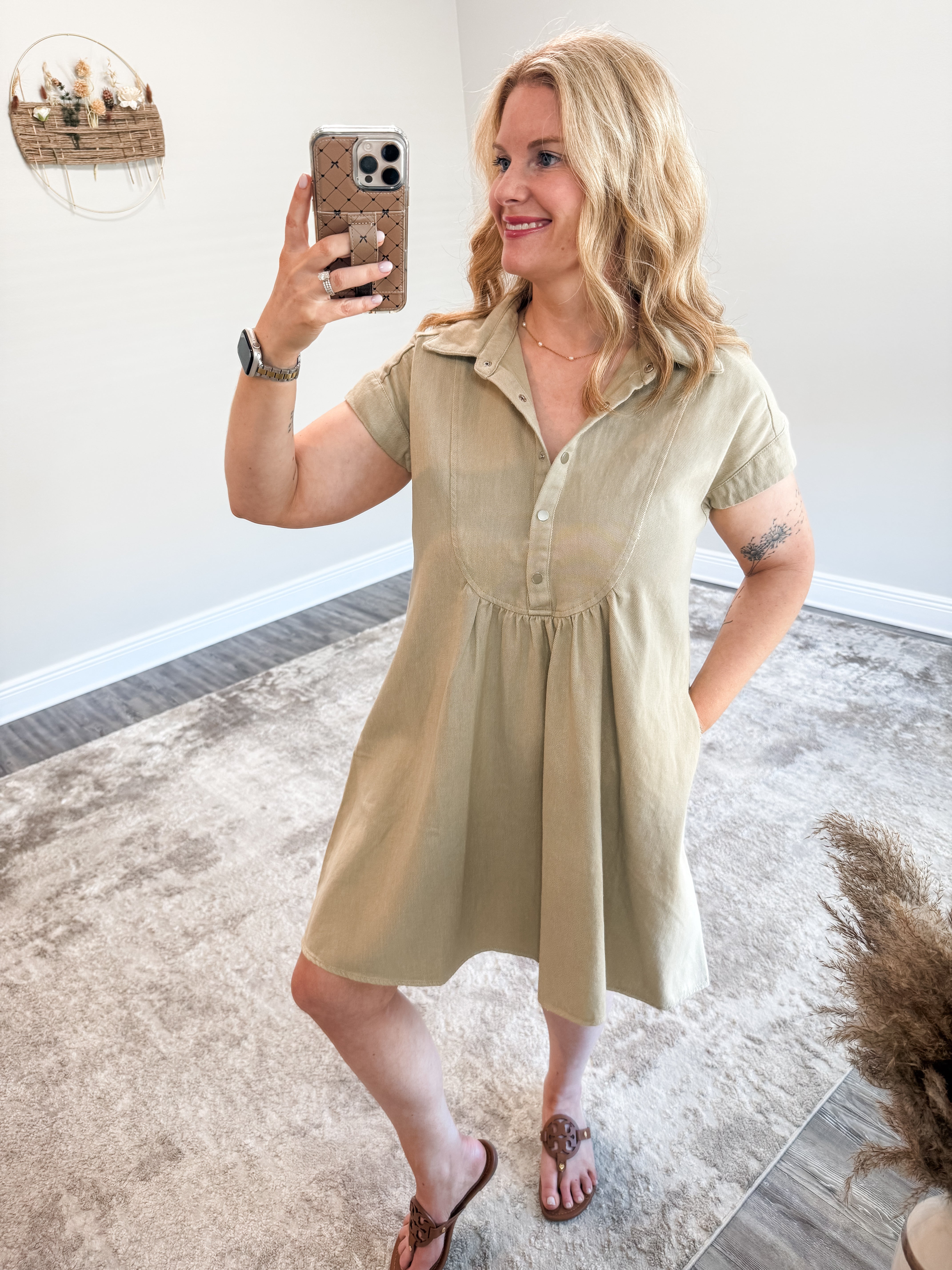 The Layla Dress, crafted from soft twill fabric with a front placket featuring snap button closure for comfort and convenience. The collar detail gives a touch of sophistication while the pleating on the front and back create a flattering silhouette. Complete with side POCKETS for functionality.