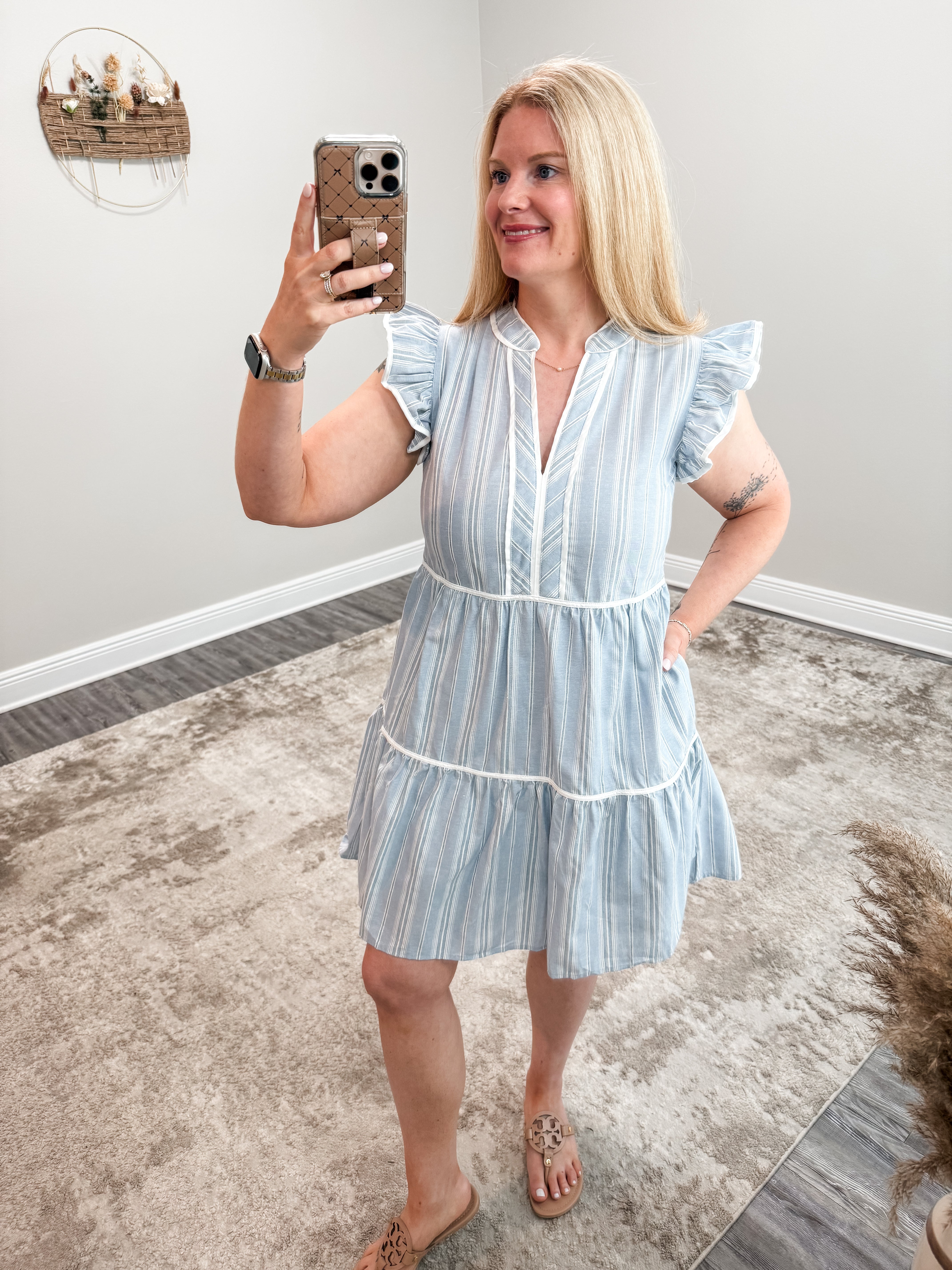 Indulge in the effortless elegance of our Coastal Mini Dress. With ruffle sleeves and a tiered design, this dress exudes a playful yet sophisticated style. The striped pattern adds a touch of charm, while POCKETS provide convenience. Perfect for any occasion, you'll feel both stylish and comfortable in this versatile dress.