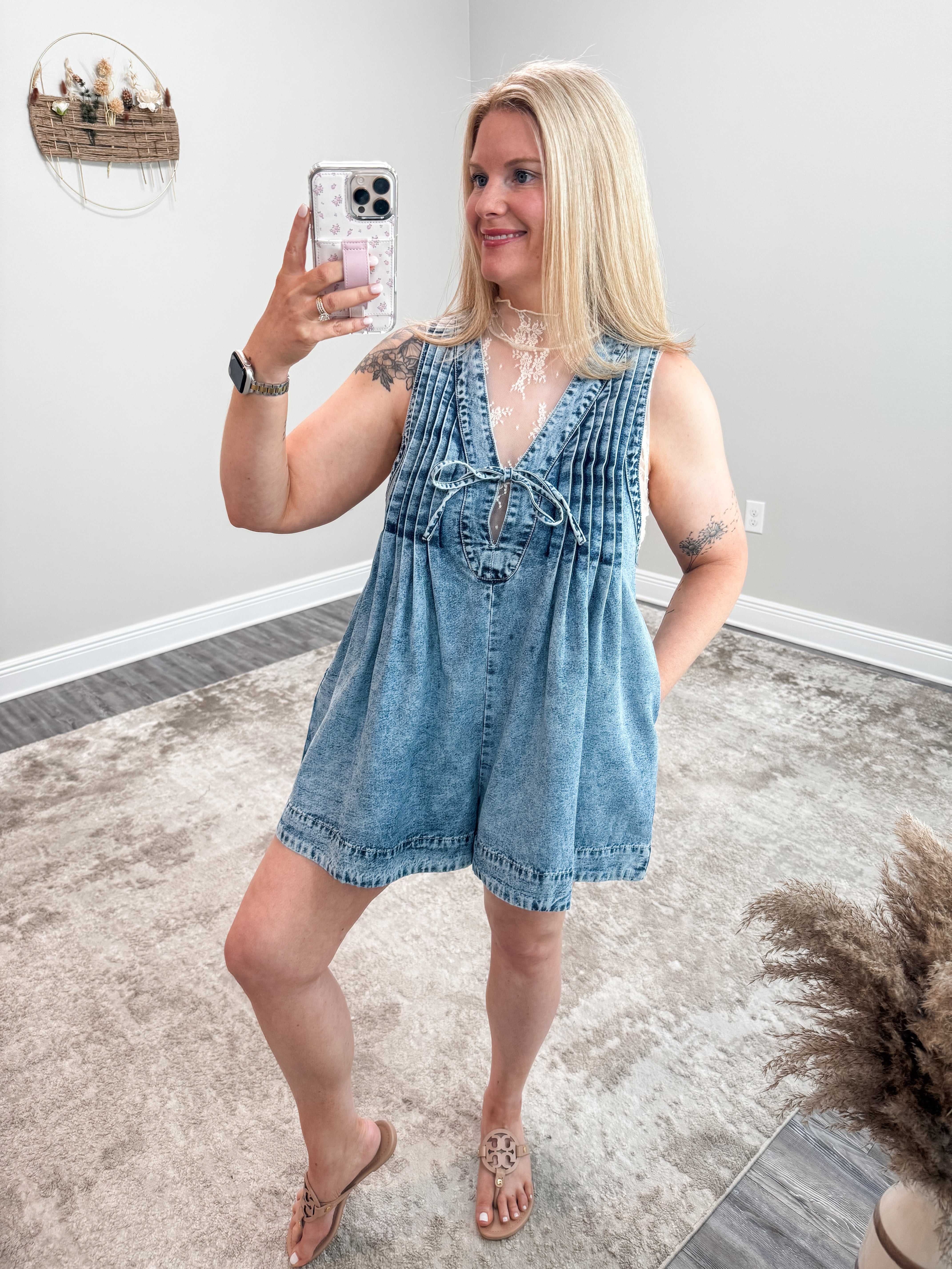 Get ready to turn heads in our Kora Denim Romper! This mini dress features a deep v-neck with a string tie for a customizable fit, as well as a pleated back detail and side pocket for added style and convenience. The sleeveless design is perfect for warm weather and the mini length is sure to show off your legs. Perfect for any occasion, this dress is a must-have in your wardrobe.