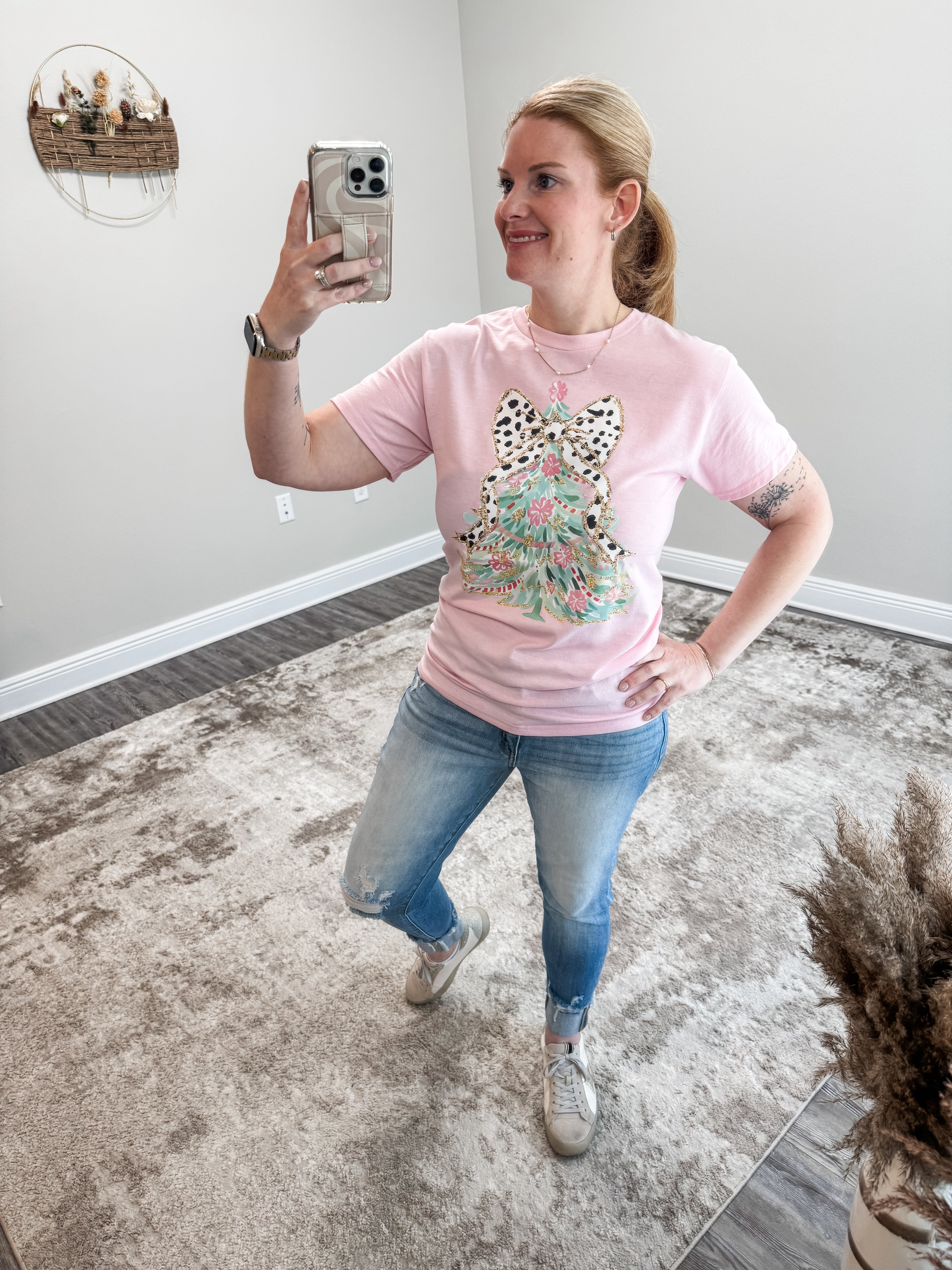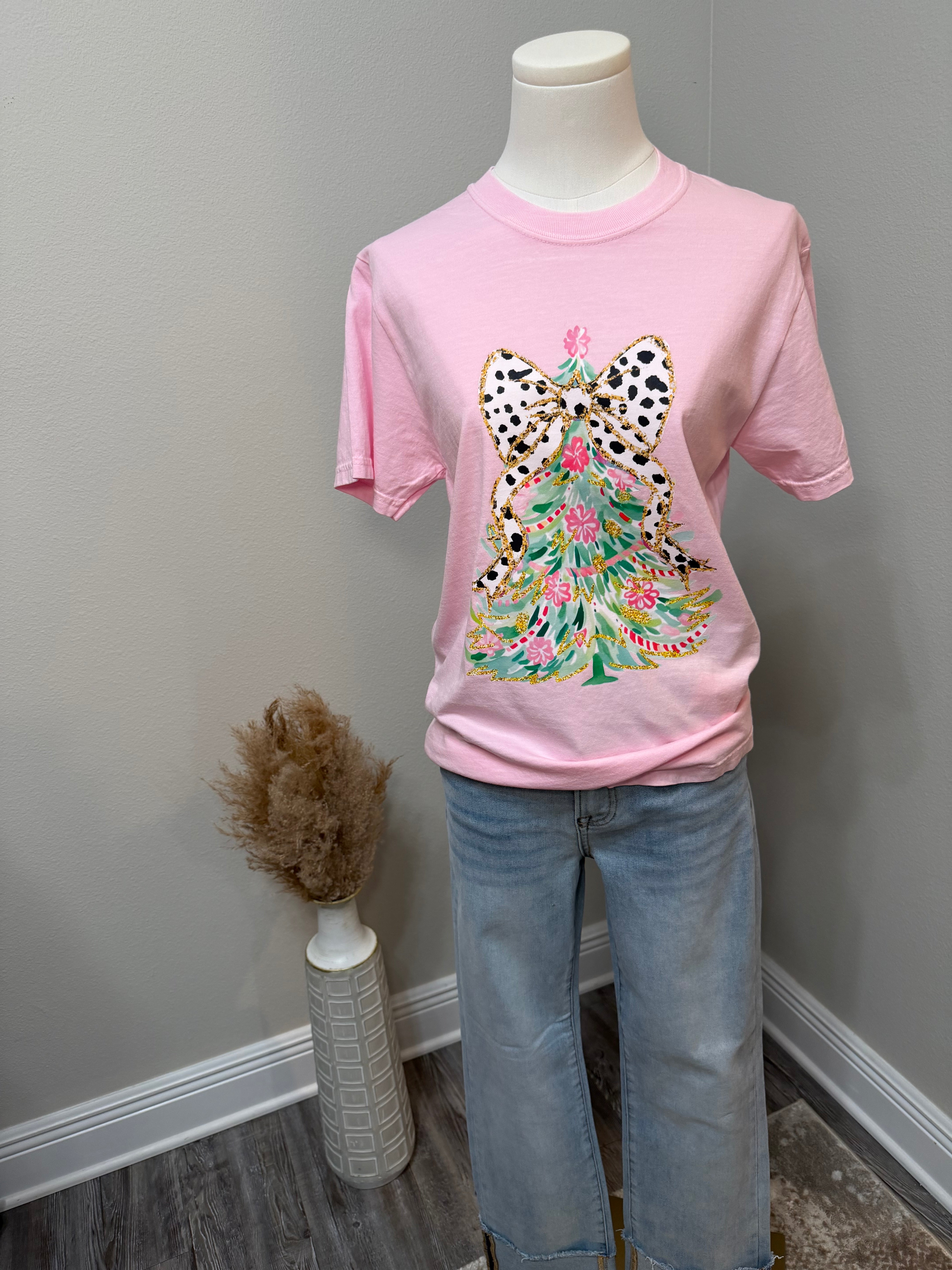 Add some fun and flair to your holiday wardrobe with our Leopard Bow Christmas Tree Tee! This adorable design features a whimsical Christmas tree adorned with festive details and topped with a bold leopard-print bow. The soft pink background adds a unique and feminine touch, making this tee a standout piece for the season.