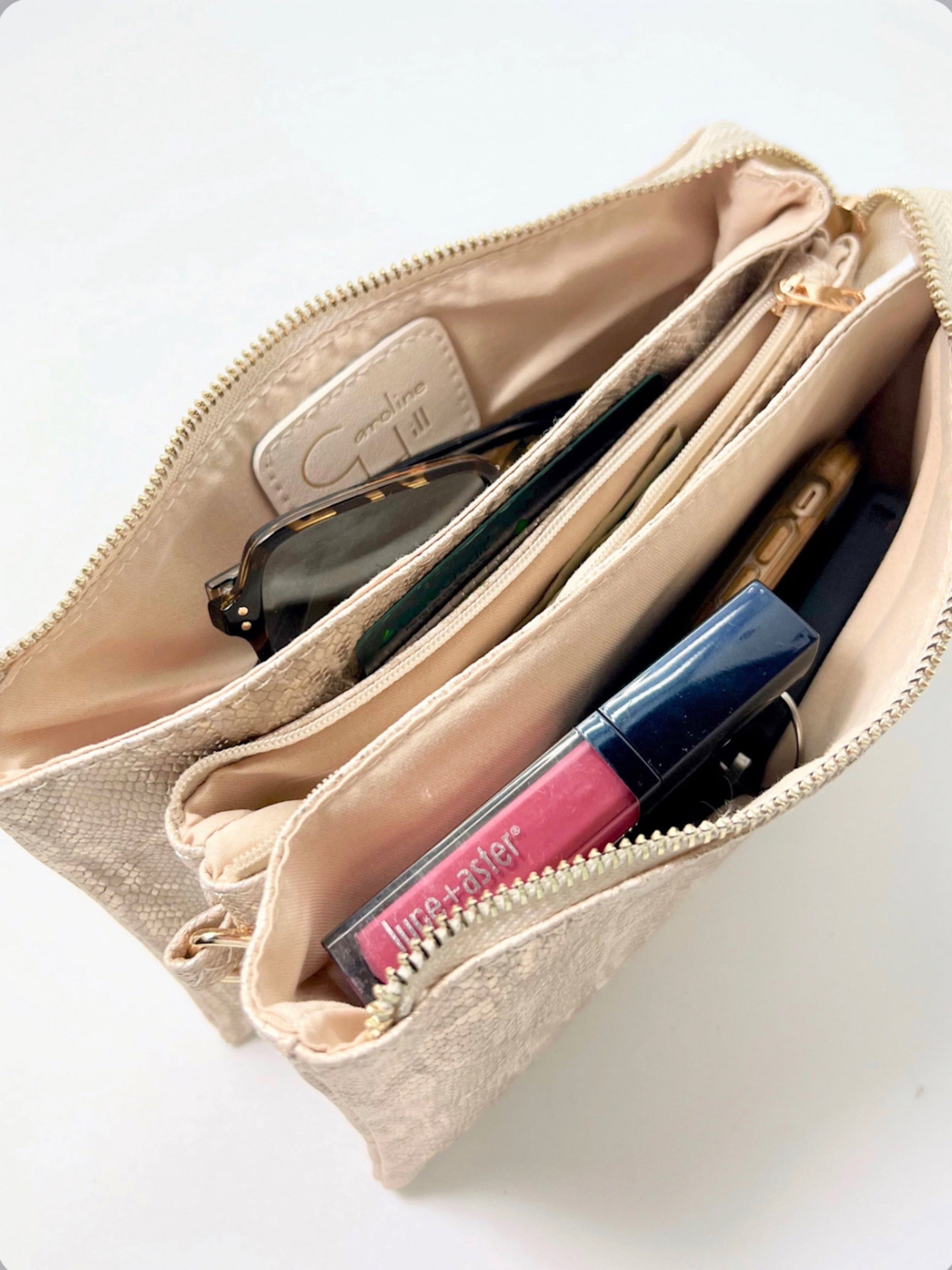 This is our all time best selling bag. It is the perfect year round bag, and an absolute staple for your wardrobe. This purse includes a crossbody strap and wristlet strap. There is an internal zip compartment and credit card slots as well. Use it alone, or throw it in your larger bag to keep things organized.