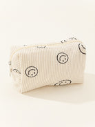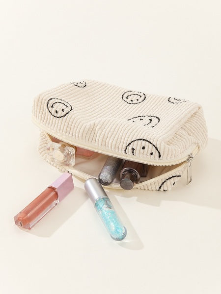 Carry all your cosmetics in style with the Smiley Face Bag. Made from high-quality corduroy, this pouch offers a large capacity to fit all your essentials. Its compact size of 5" height, 7" width, and 2.5" depth make it perfect for on the go touch-ups. Machine wash friendly for easy maintenance.