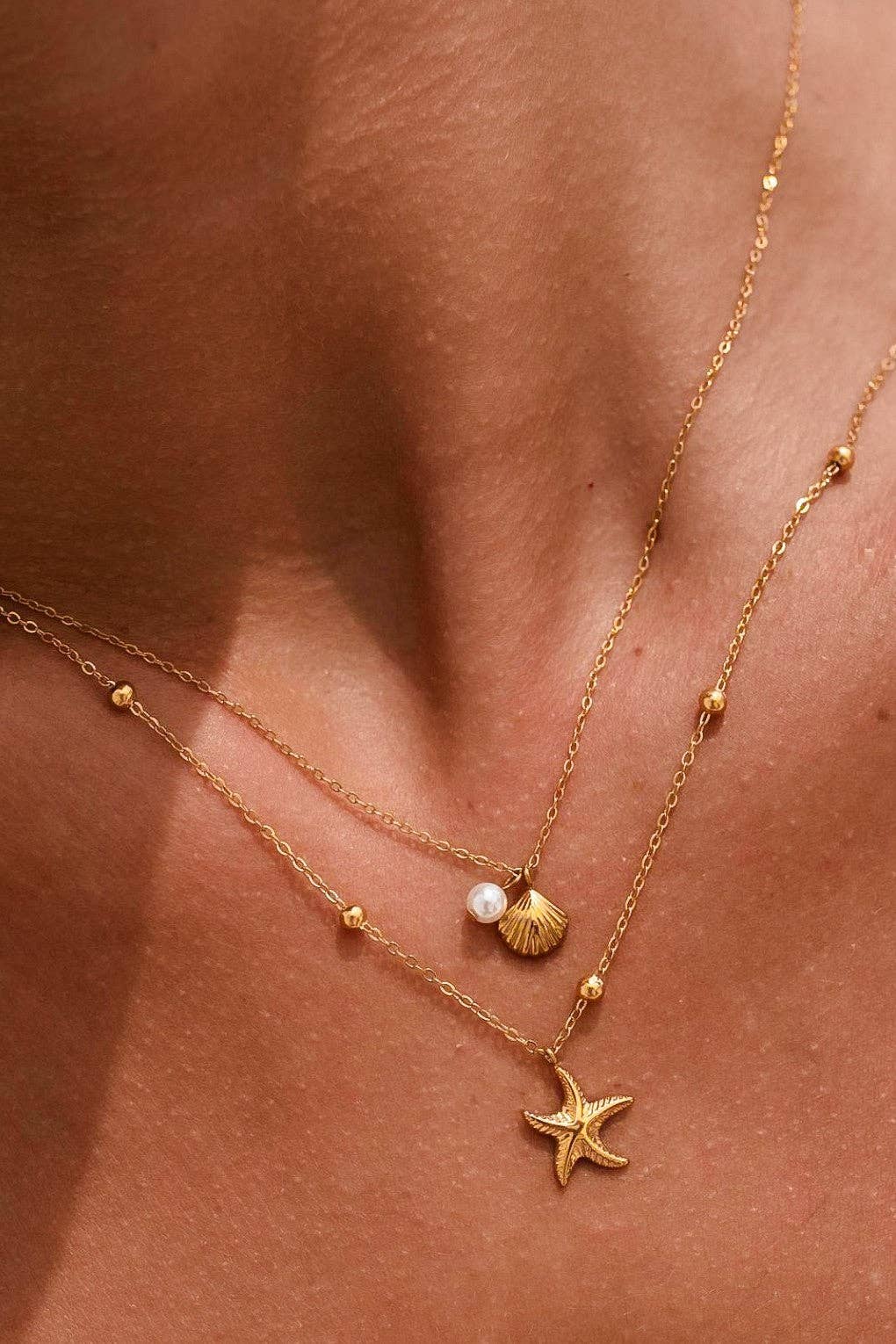 Make a splash with this enchanting starfish and seashell layered necklace, crafted from premium 18K gold-plated stainless steel. Featuring adjustable lengths starting at 16" with a 2" extender, it adapts to your style effortlessly. Hypoallergenic and waterproof, this piece withstands beach days, workouts, and everyday wear without compromising its radiant finish. The delicate double-chain design offers versatile layering options or stunning solo wear. Whether you're channeling coastal vibes or seeking a timeless gold accent, this durable necklace delivers both beauty and practicality. Protect its lustrous shine by keeping it away from lotions, perfumes, and cleaning products. Your go-to piece for summer adventures and beyond.