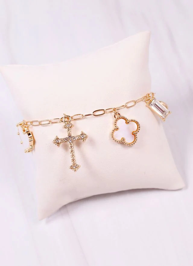 This fabulous link bracelet features an array of charms. Each piece has it's own unique design for a gorgeous style look. Wear by itself or in a full stack with other bracelets.
