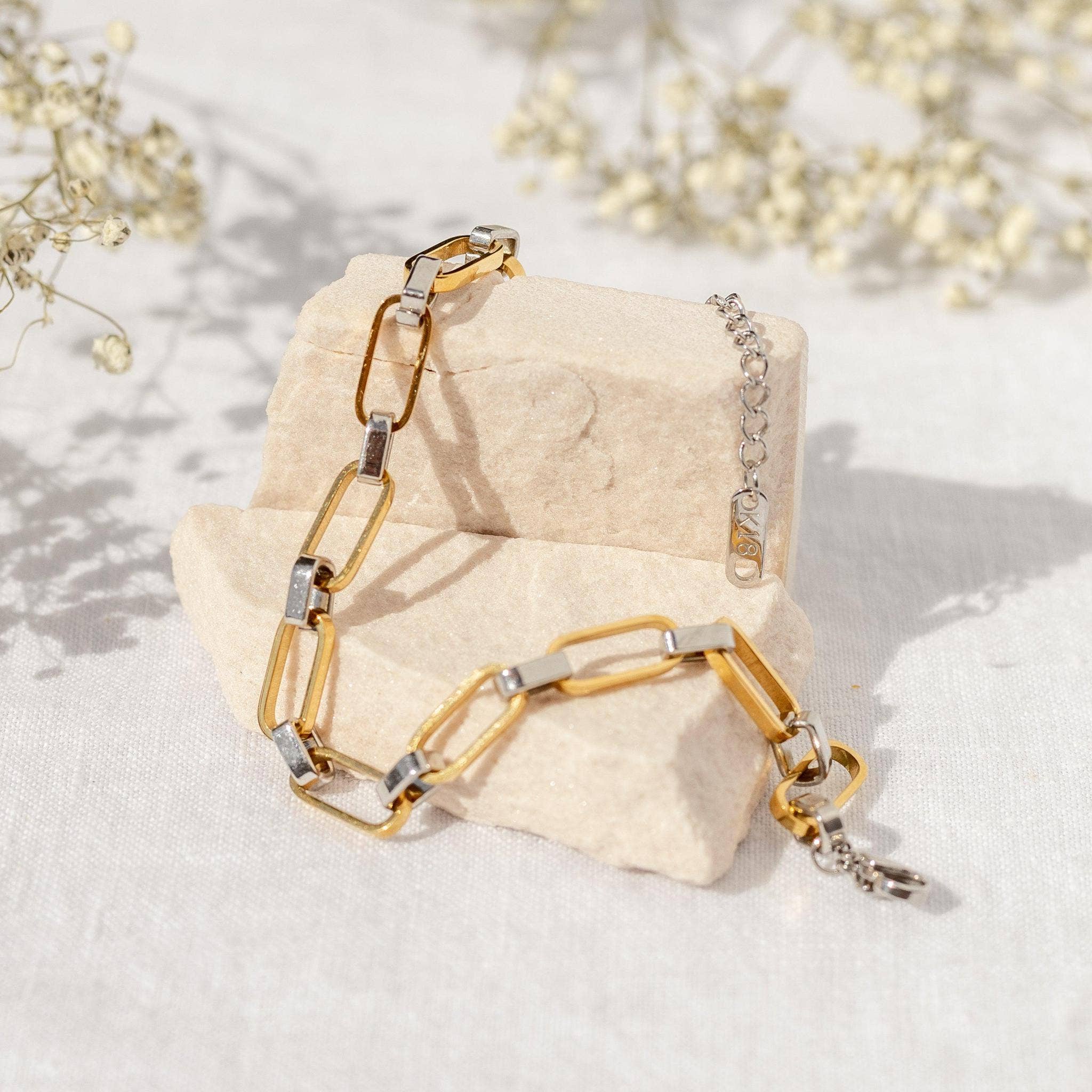 Crafted with care, the Everly Bracelet Intermix combines timeless elegance with everyday wearability. This stunning piece features 18K gold plating over hypoallergenic stainless steel, making it perfect for sensitive skin. The nickel-free and lead-free construction ensures peace of mind with every wear. Adjustable from 7" to 9" with a secure lobster clasp, it adapts to your wrist effortlessly. Water-resistant design means you can wear it confidently through your day, from morning coffee to evening adventures.