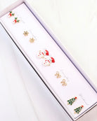 Add a playful touch to your holiday look with the Friendly Frosty Earring Set in White. This charming set features five petite studs, including enamel reindeer, snowman, and trees, paired with gold snowflakes and bows. Stylish and festive, it makes an ideal gift for celebrating the season in fashionable spirit.