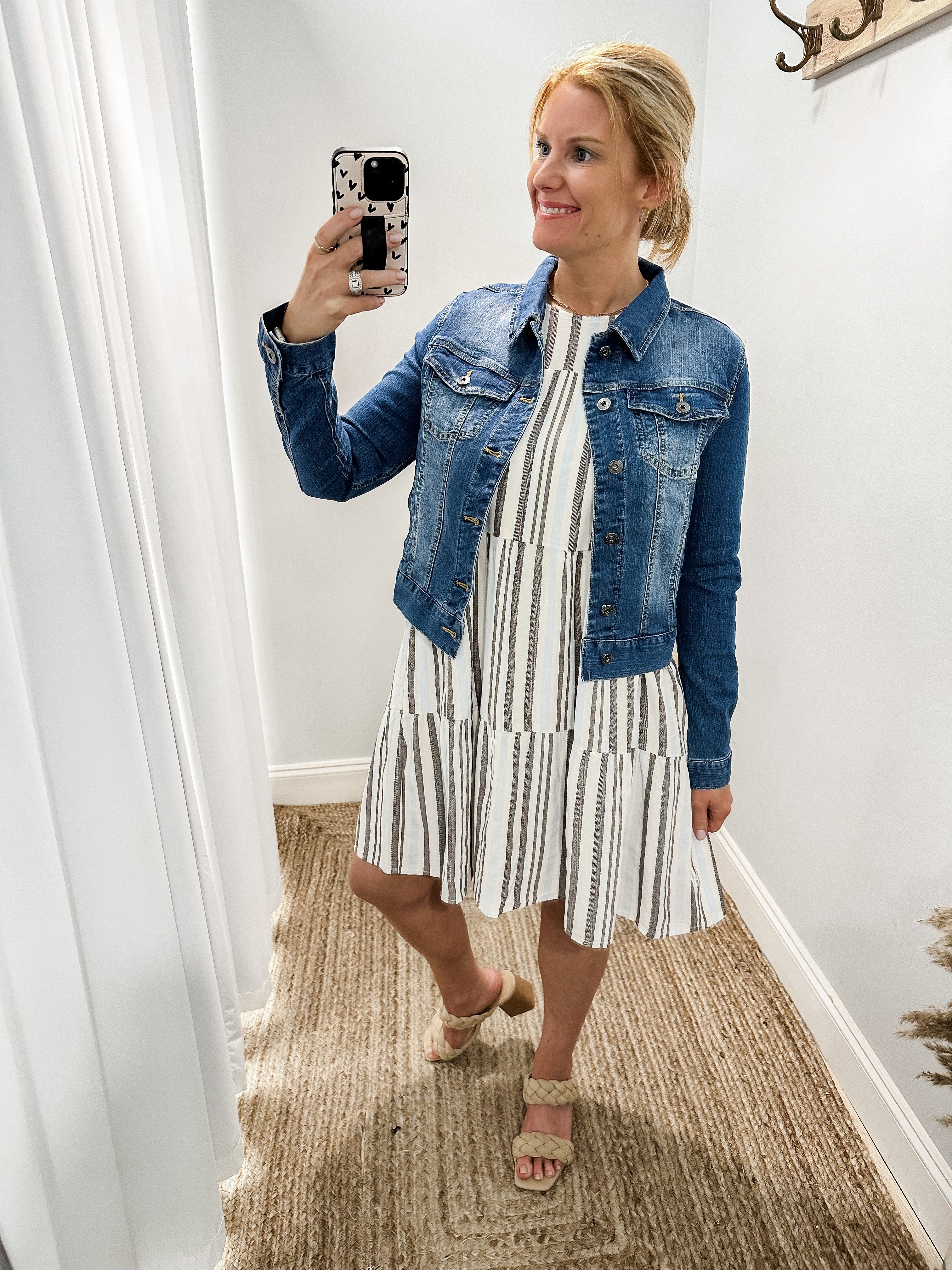 This jacket has light distressing and some stretch! Even though we’re getting warmer weather, it’s still perfect for a cover up!