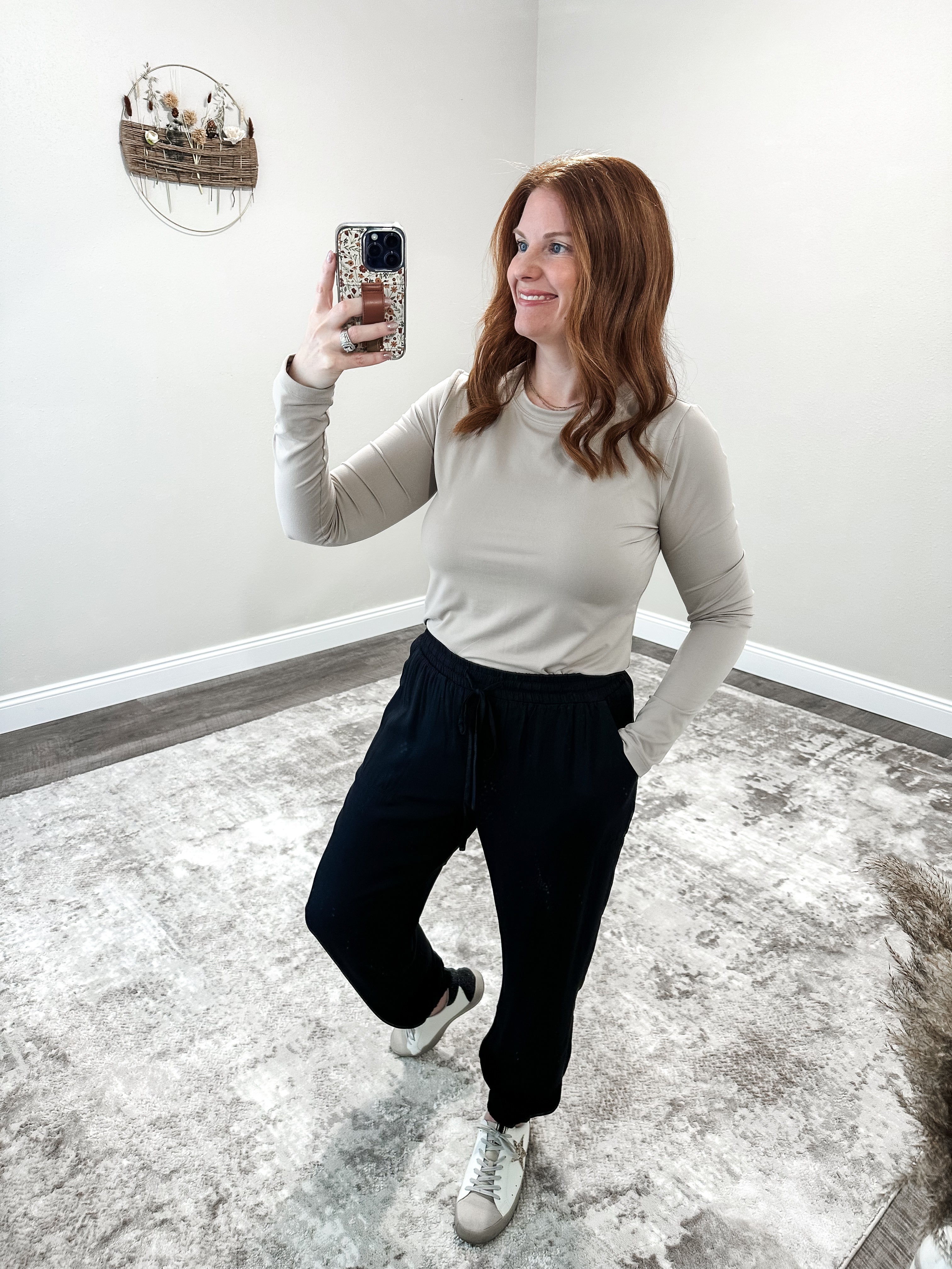 Jogger pants with drawstring and pockets. This material is great for any season.