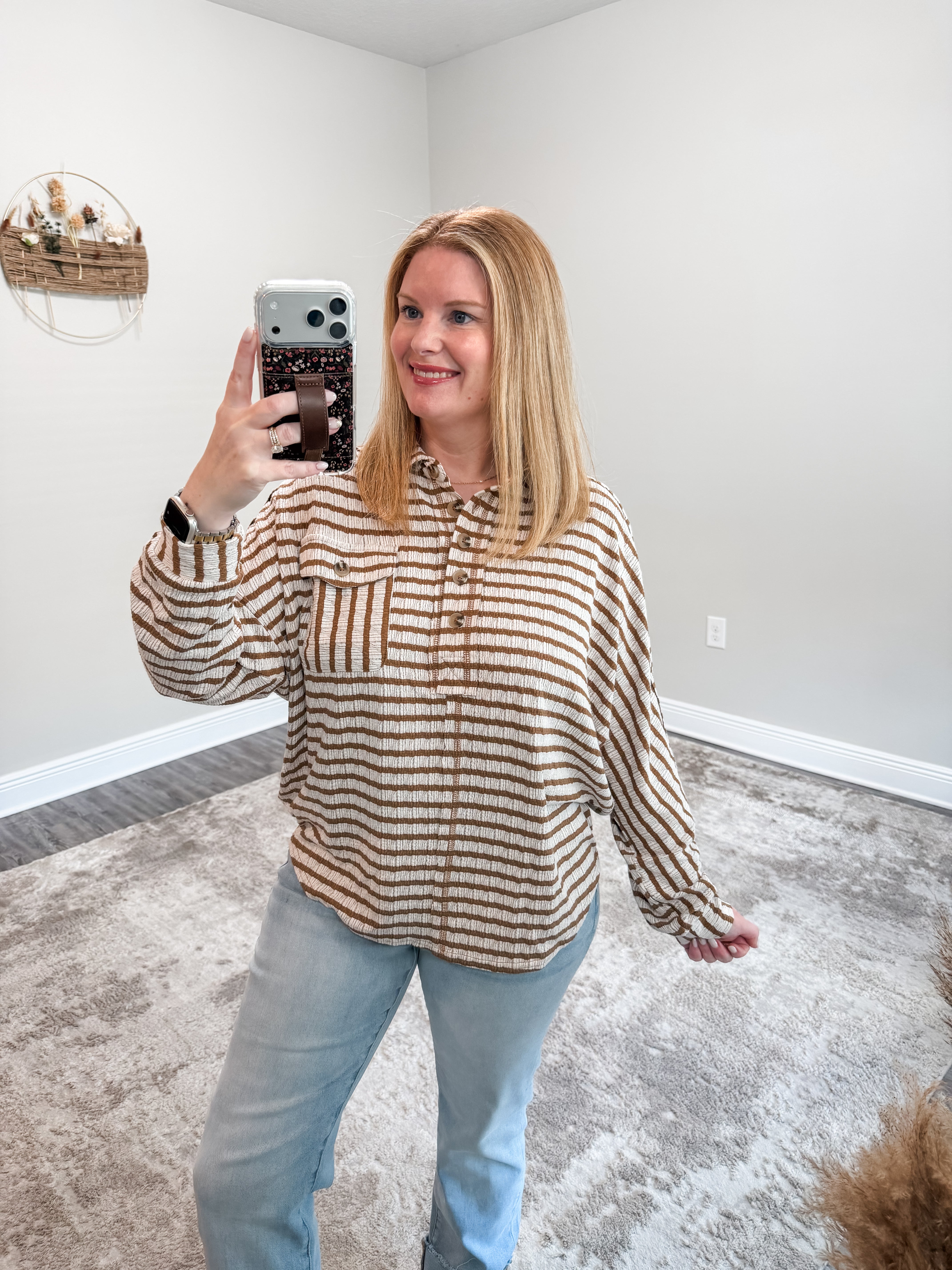 The Dani Top brings understated elegance to your casual wardrobe. This oversized knit features a subtle textured stripe that adds dimension without overwhelming your look. The collared neckline offers a polished touch, while the half button-down front gives you styling flexibility—button it up for a put-together appearance or leave it open for relaxed charm. Batwing sleeves create a dramatic, flattering silhouette that feels both comfortable and intentional. The rounded hem and generous oversized fit make this piece perfect for layering or wearing solo. Whether you're dressing up a casual day or keeping things effortlessly chic, the Dani Top delivers versatile style that works with everything in your closet.