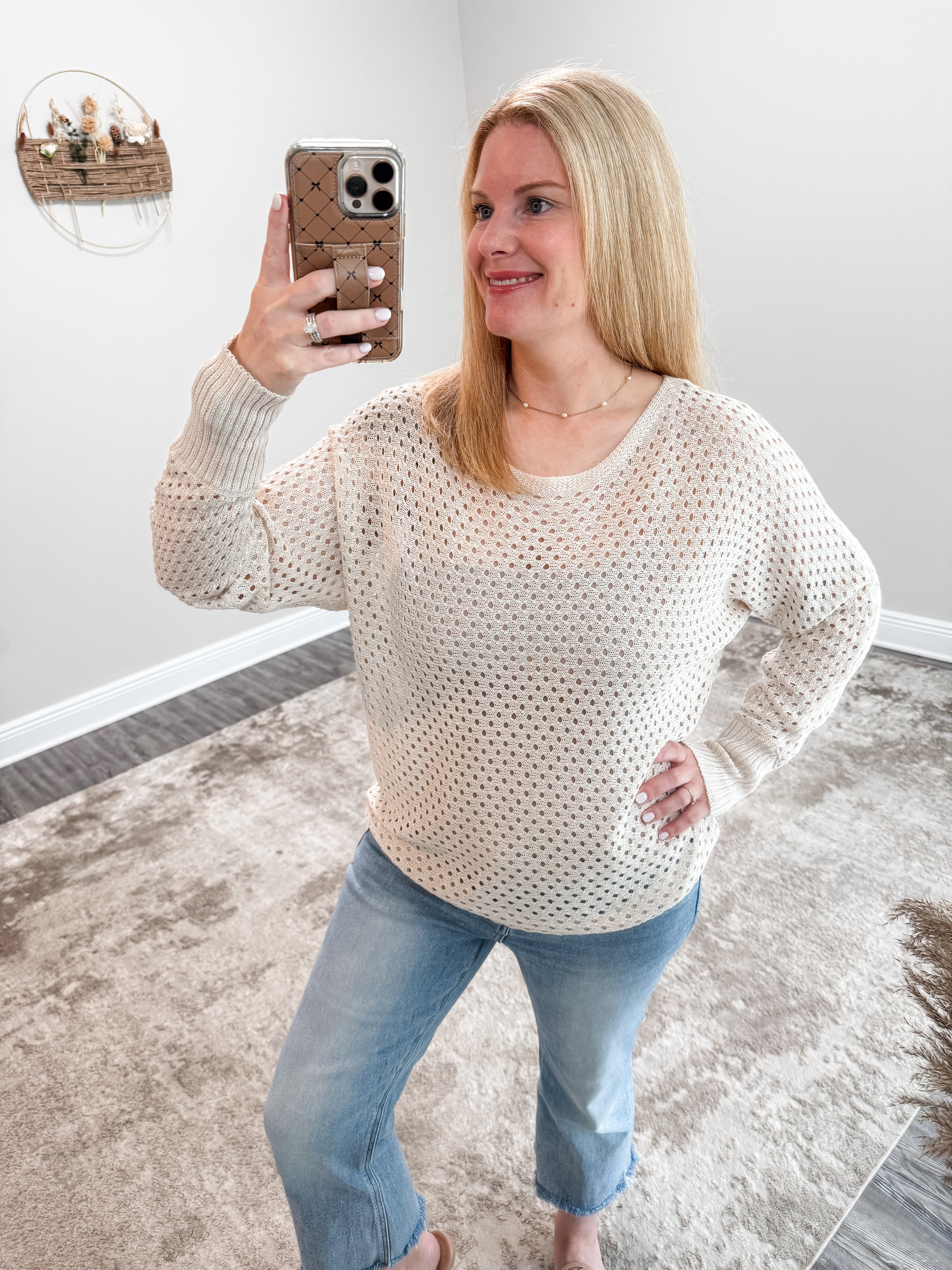 Introducing our Eyelet Knit Sweater Top! Made from high quality material, this sweater features a beautiful eyelet knit design and ribbed cuff sleeves. It's the perfect light cover up for any occasion. Layer it over a dress or pair it with jeans for a versatile and stylish look. Order now and elevate your wardrobe with this must-have piece!