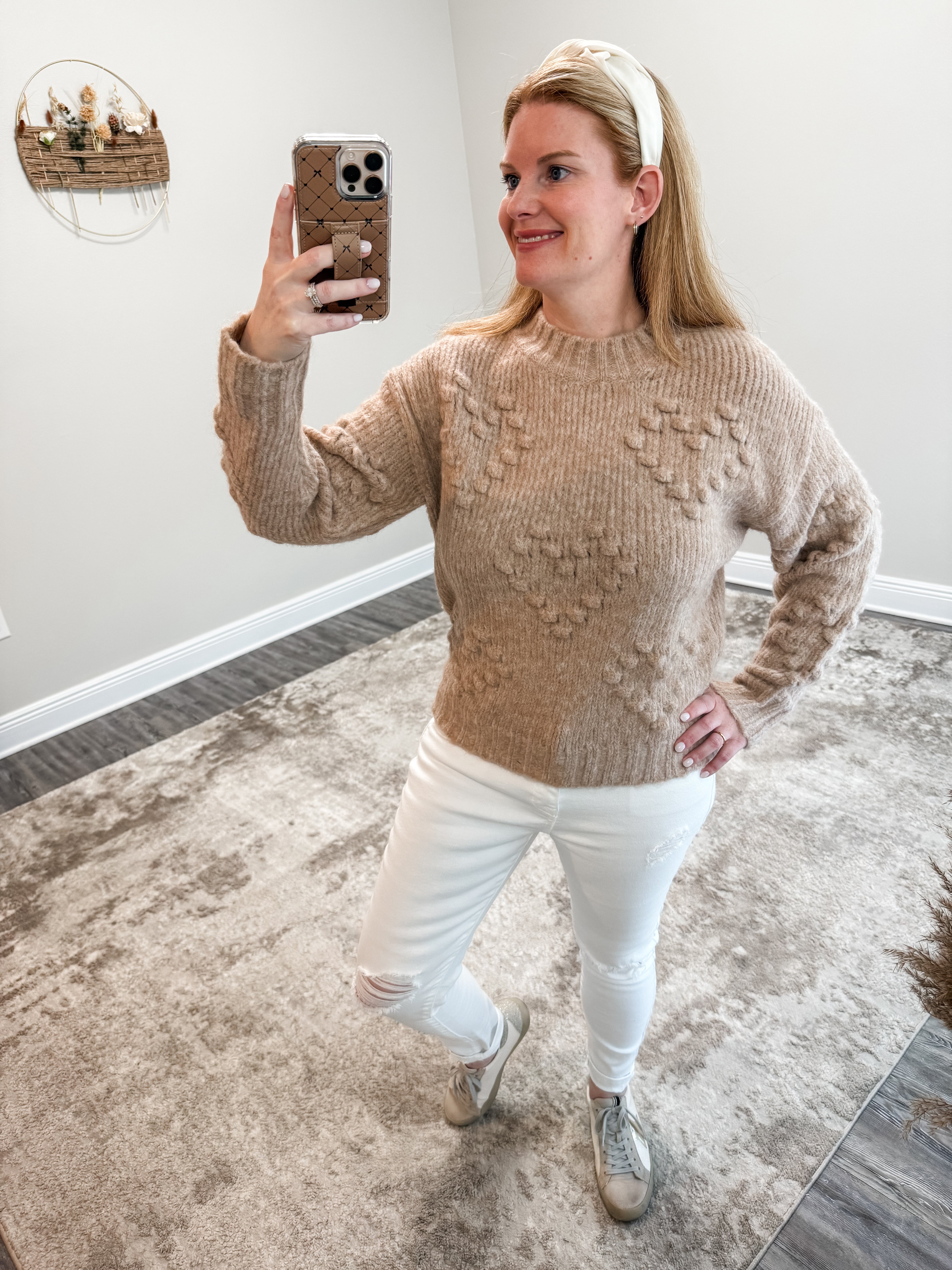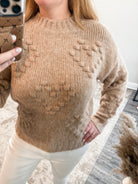 Introducing a delightful and charming heart-shaped pom pom sweater pullover that effortlessly blends comfort and playfulness. This pullover features a soft and textured knit fabric adorned with adorable heart-shaped pom poms. With its comfortable fit and relaxed vibe, this sweater pullover is perfect for staying warm while maintaining a fashionable look. The heart-shaped pom poms bring a cheerful and whimsical touch to your outfit.