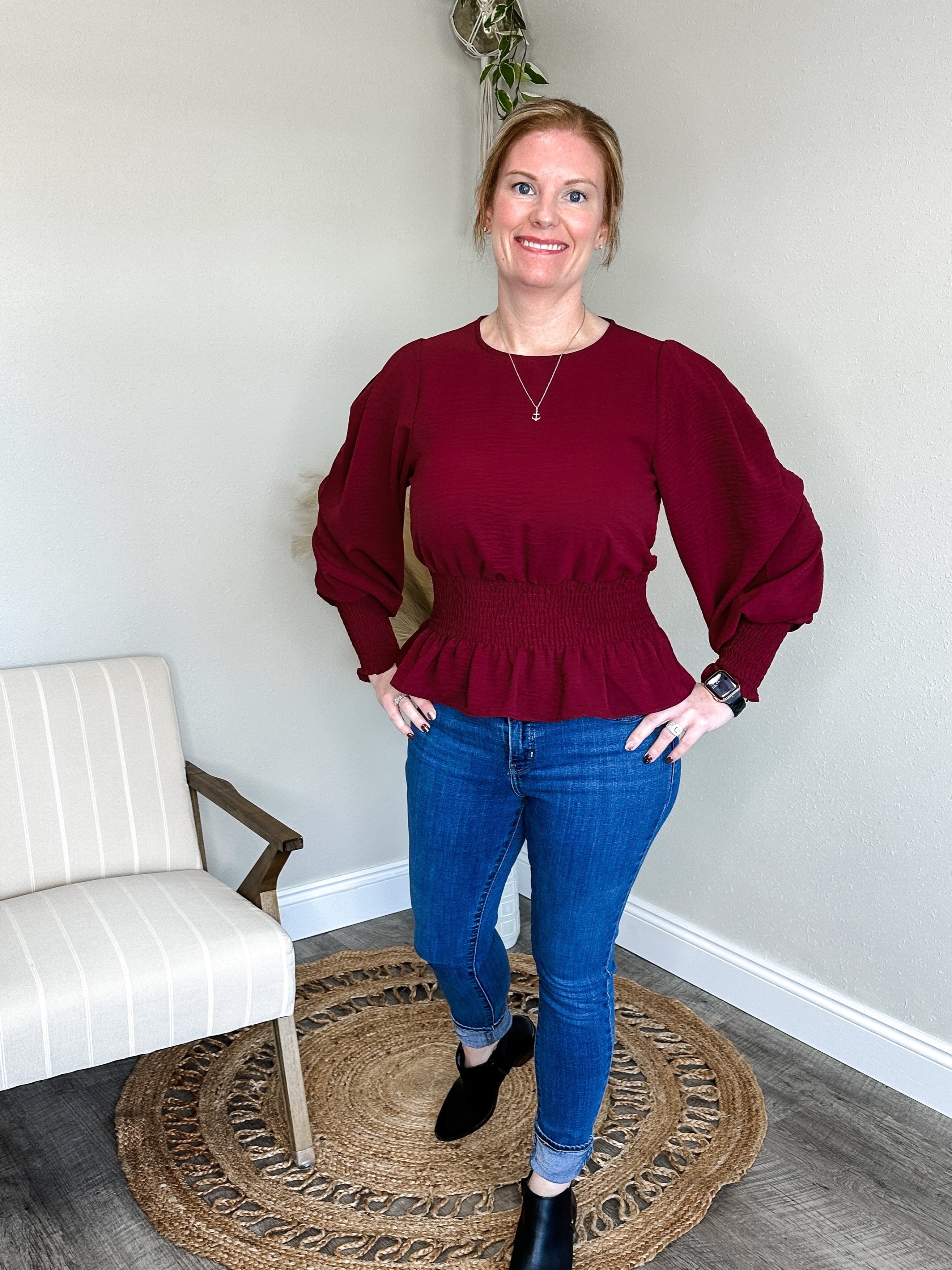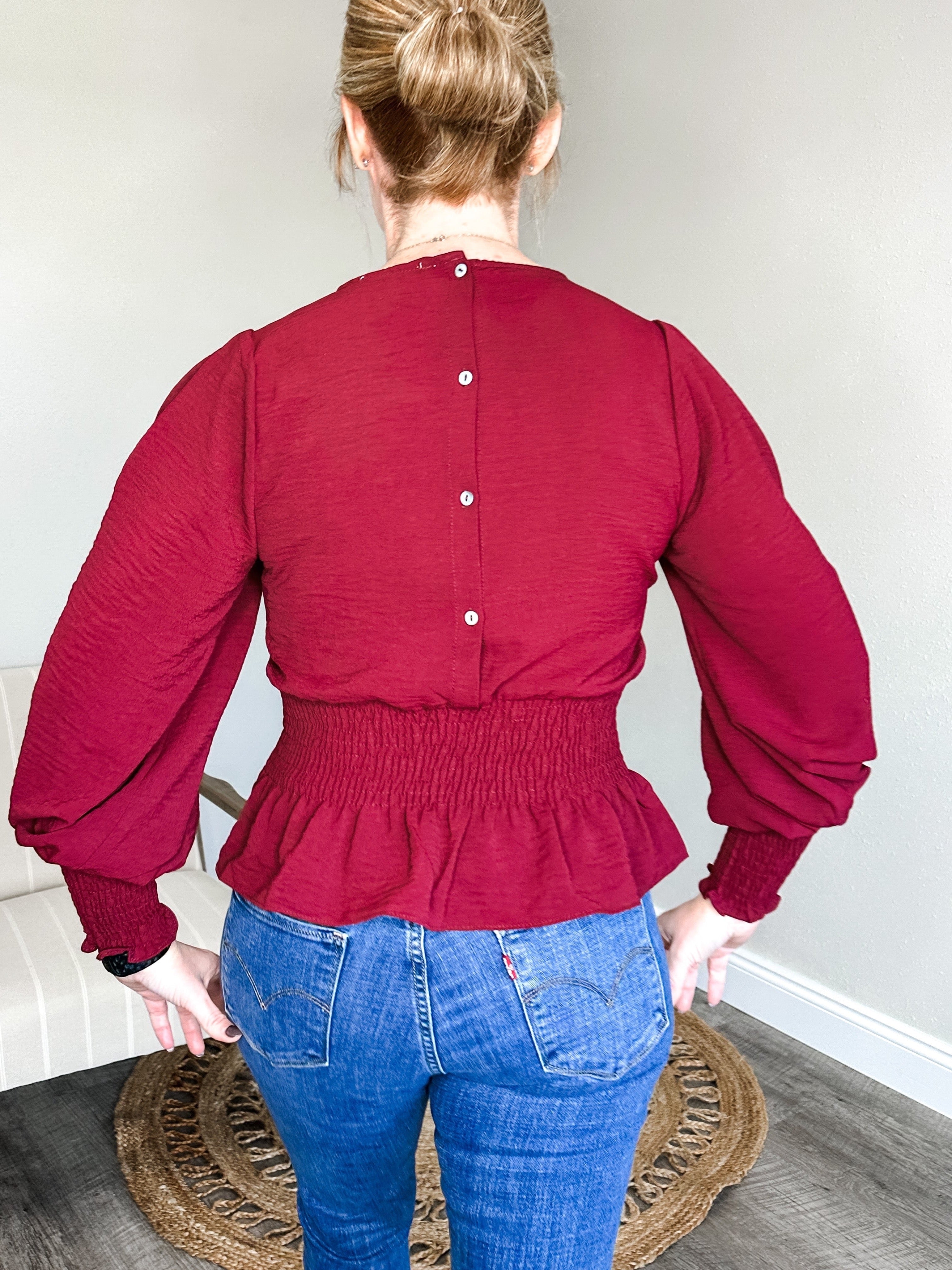 Smocked long sleeve woven top with back buttons and pleated shoulder detail.