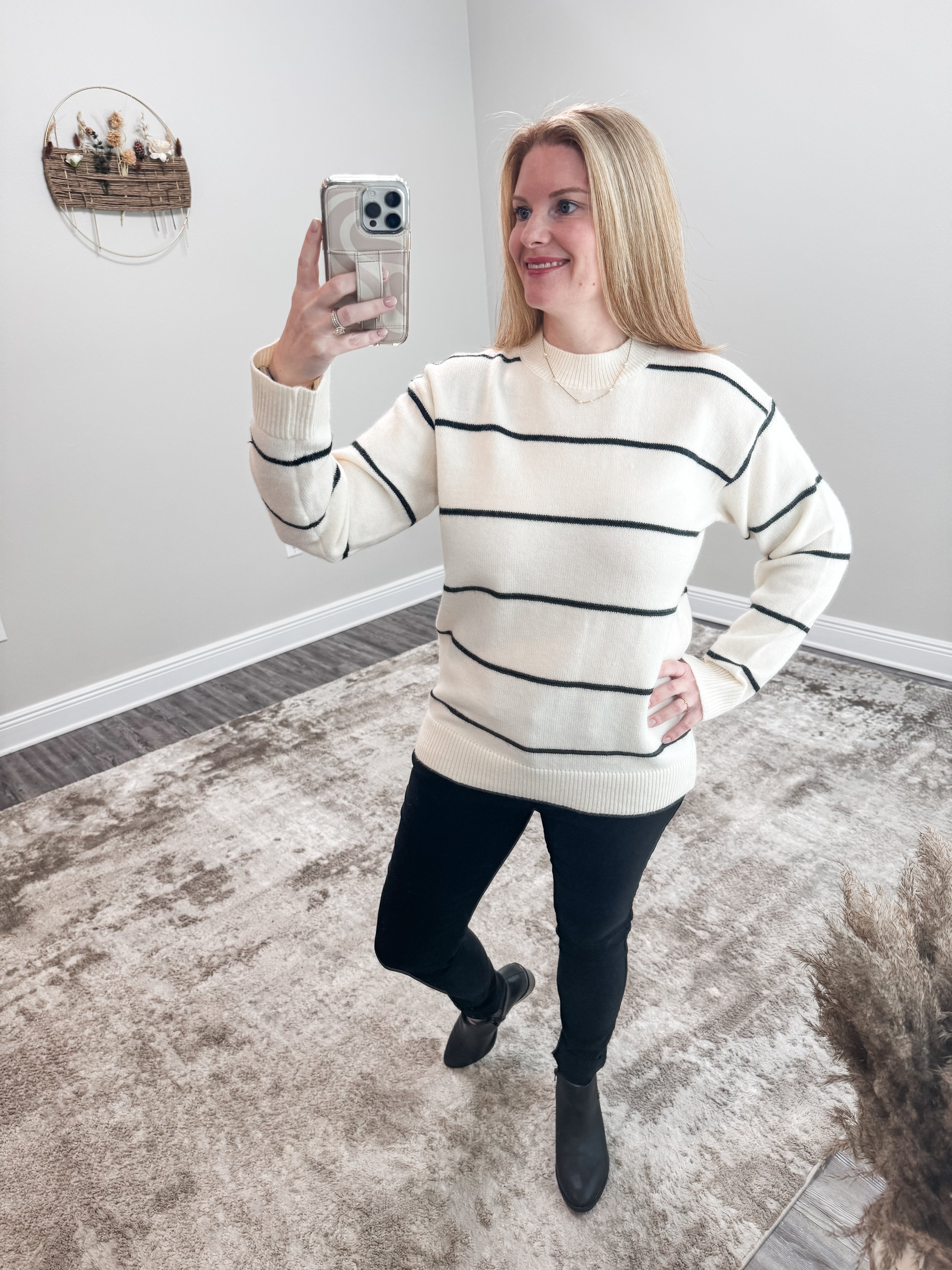 Timeless stripe sweater featured in a loose fit. Sure to be your go-to pullover to take you from season to season, this cool and classic piece is perfect to pair with anything from a skirt to shorts to structured denim.