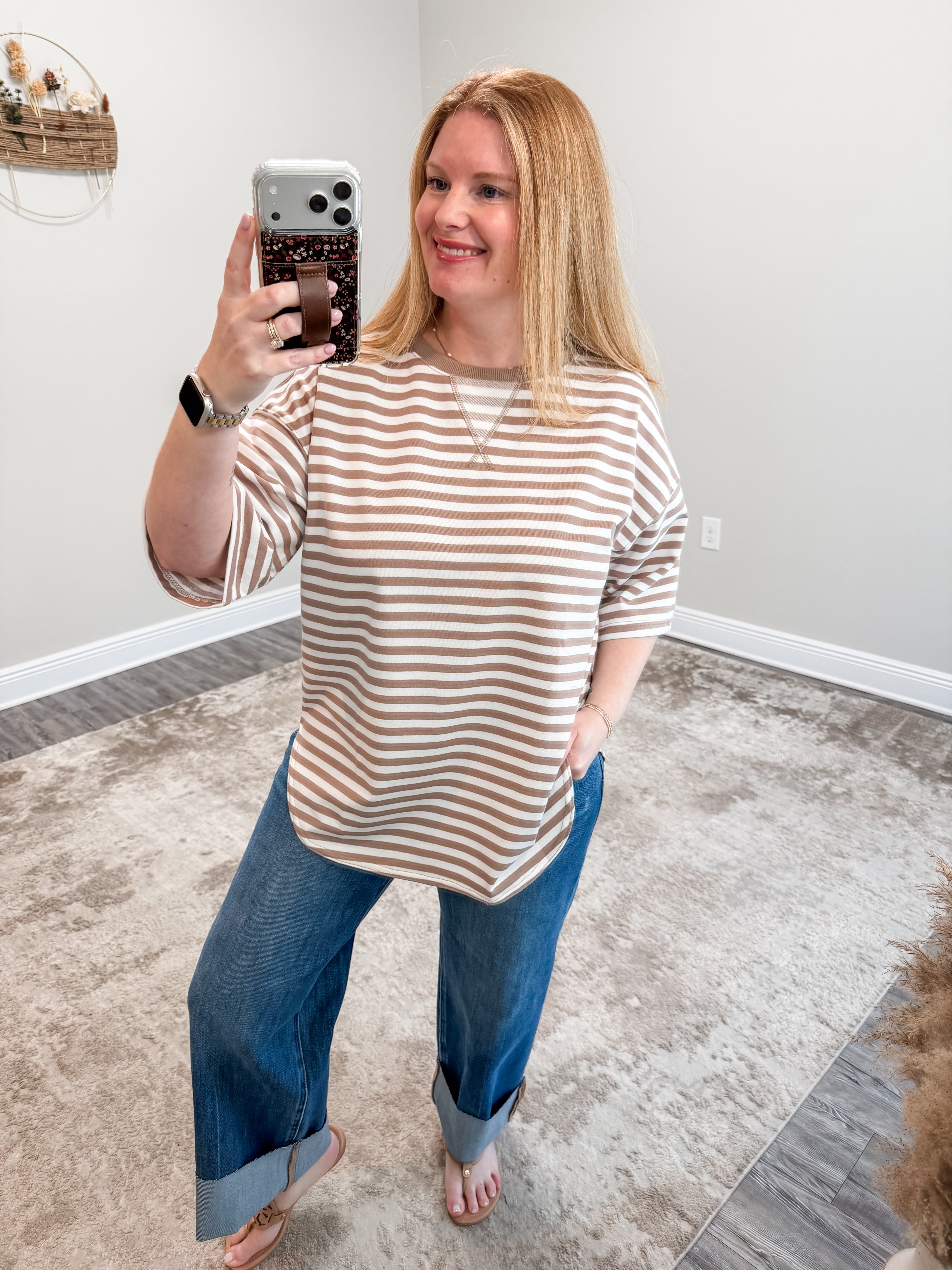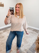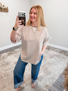 The Calla Top is a casual striped tee designed for effortless everyday wear. Crafted from soft, breathable fabric, it features a relaxed silhouette with oversized short sleeves and a gently rounded hem. The round neckline showcases a subtle V-stitch detail that adds visual interest, while the lightweight construction makes it perfect for warm weather or layering. Slip it on for a laid-back look that feels as good as it looks.