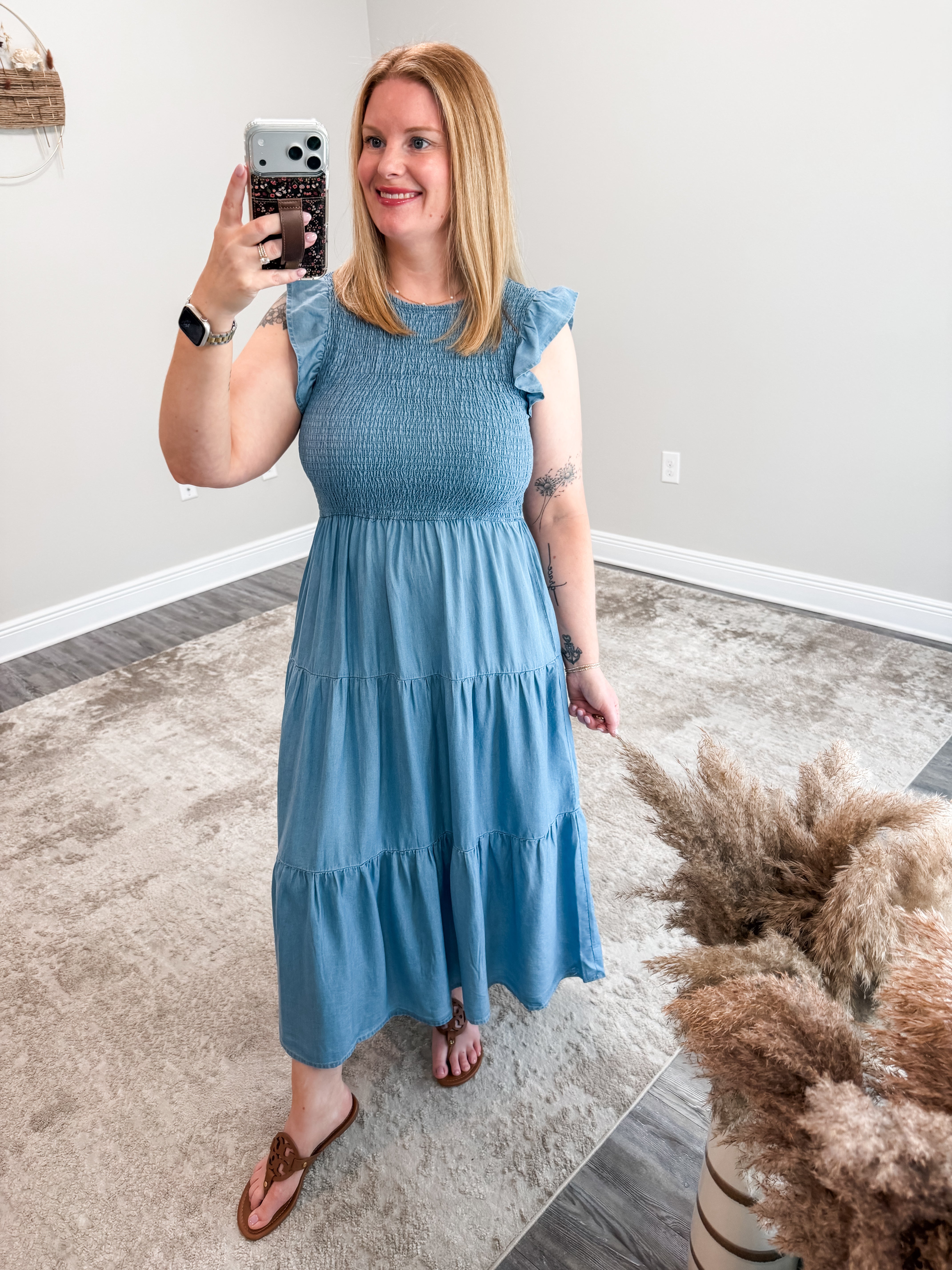 The Addison Smocked Midi Dress is a timeless wardrobe essential that combines comfort with understated sophistication. Crafted with a round neckline and ruffled sleeve trim, this midi dress showcases an expertly smocked bodice that flatters every figure. The tiered design drapes beautifully in soft chambray hues, creating movement and dimension. Unlined for breathable wear, it's perfect for warm weather styling. Whether you're dressing up for an evening out or keeping it casual, this versatile piece effortlessly transitions between occasions with its romantic, relaxed aesthetic.