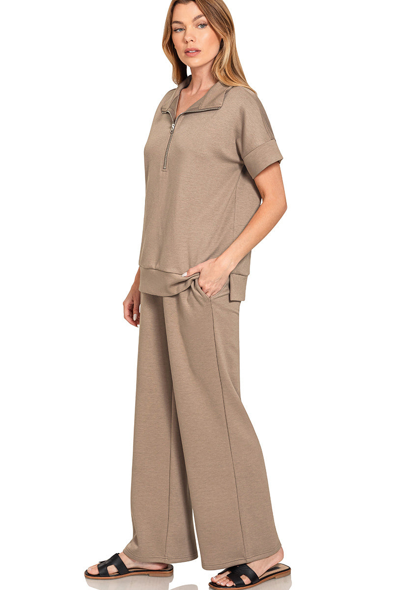 Discover comfort meets style with the Harper Set in mocha—a chic two-piece collection that transitions seamlessly from day to night. The high-neck half-zip top features a relaxed silhouette, while the matching wide-leg pants offer an elevated look with practical side pockets and an easy elastic waistband. Made from soft scuba fabric, this set provides the cozy feel you crave without sacrificing sophistication. Perfect for layering or wearing solo, the Harper Set is your go-to choice for effortless, polished everyday wear that keeps you feeling confident and comfortable.