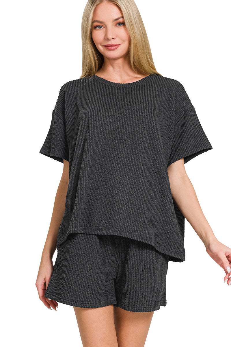 Experience ultimate comfort and style with the Maggie Ribbed Set. Made with soft corded rib material, this set includes a short sleeve tee and shorts with a pocket for added convenience. The round-neck tee adds a touch of elegance to this casual ensemble. Upgrade your loungewear game now!
