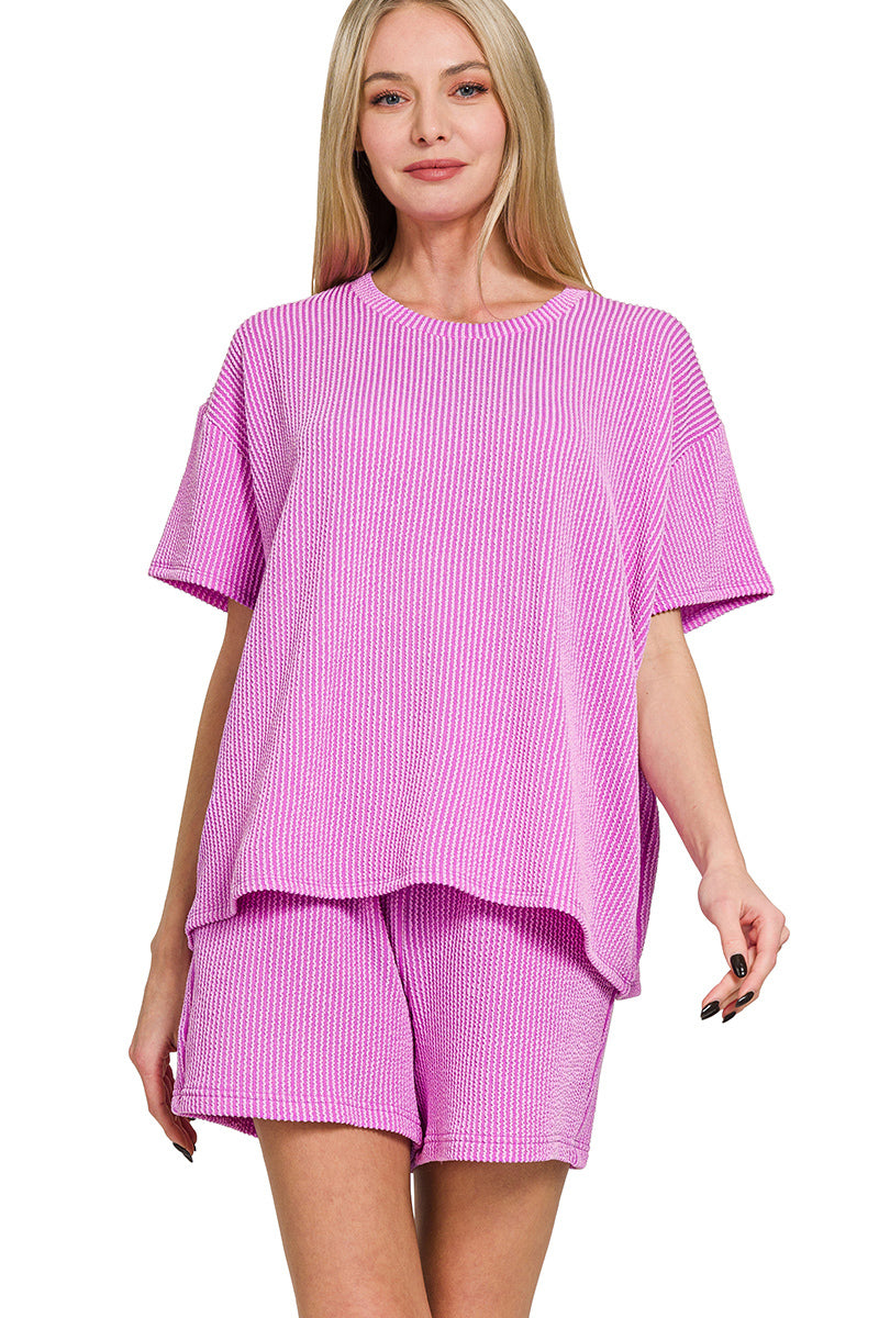 Experience ultimate comfort and style with the Maggie Ribbed Set. Made with soft corded rib material, this set includes a short sleeve tee and shorts with a pocket for added convenience. The round-neck tee adds a touch of elegance to this casual ensemble. Upgrade your loungewear game now!