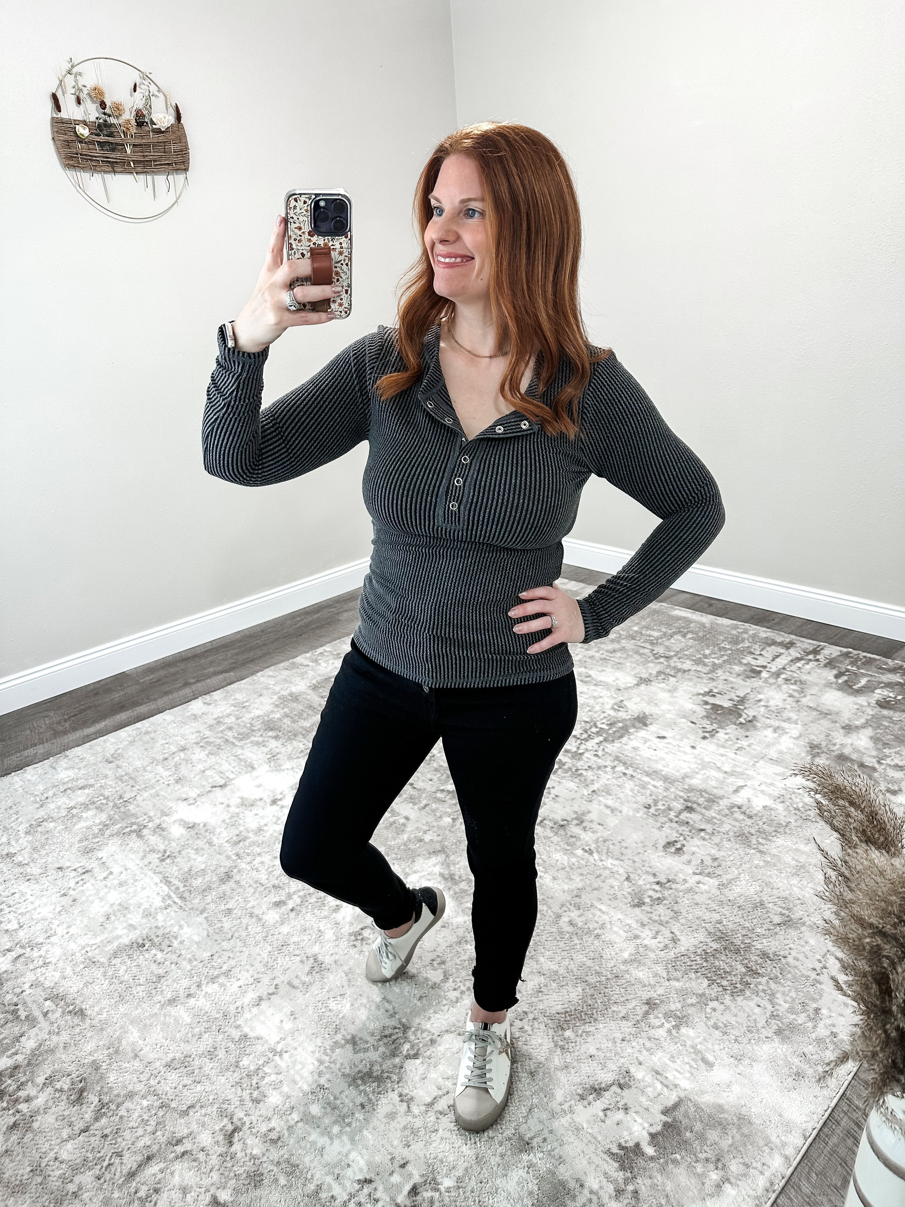 This Abbie Henley charcoal longsleeve top features the classic style of a henley with buttons halfway down the front for easy adjusting. Its comfortable and timeless design makes it perfect for any season.