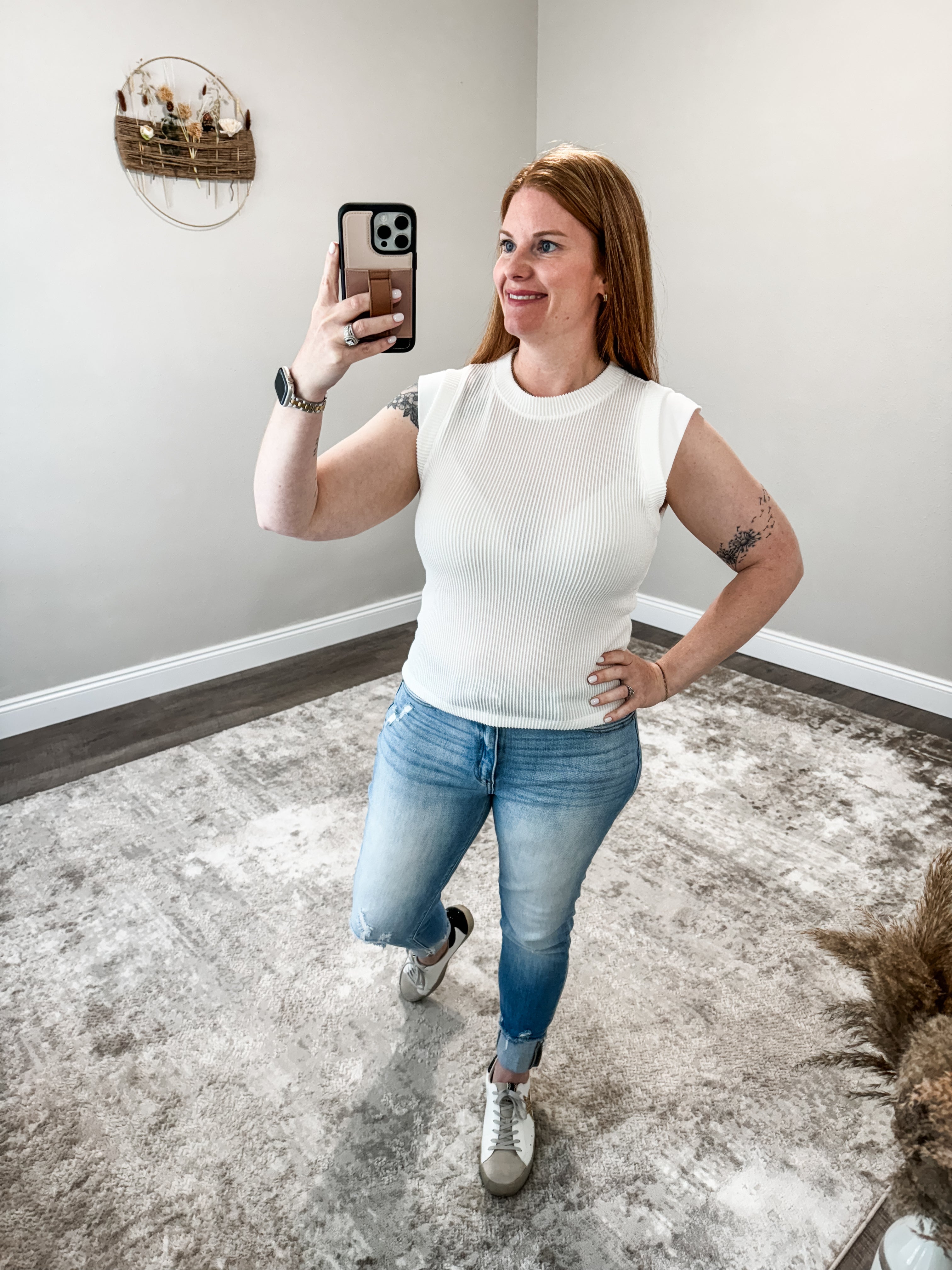 The Amelia Top in Blush offers a ribbed round neck tank design with a unique cuff on the shoulder for added texture. Crafted for both comfort and style, this top adds a touch of sophistication to any outfit. Perfect for any occasion, elevate your wardrobe with this versatile piece.