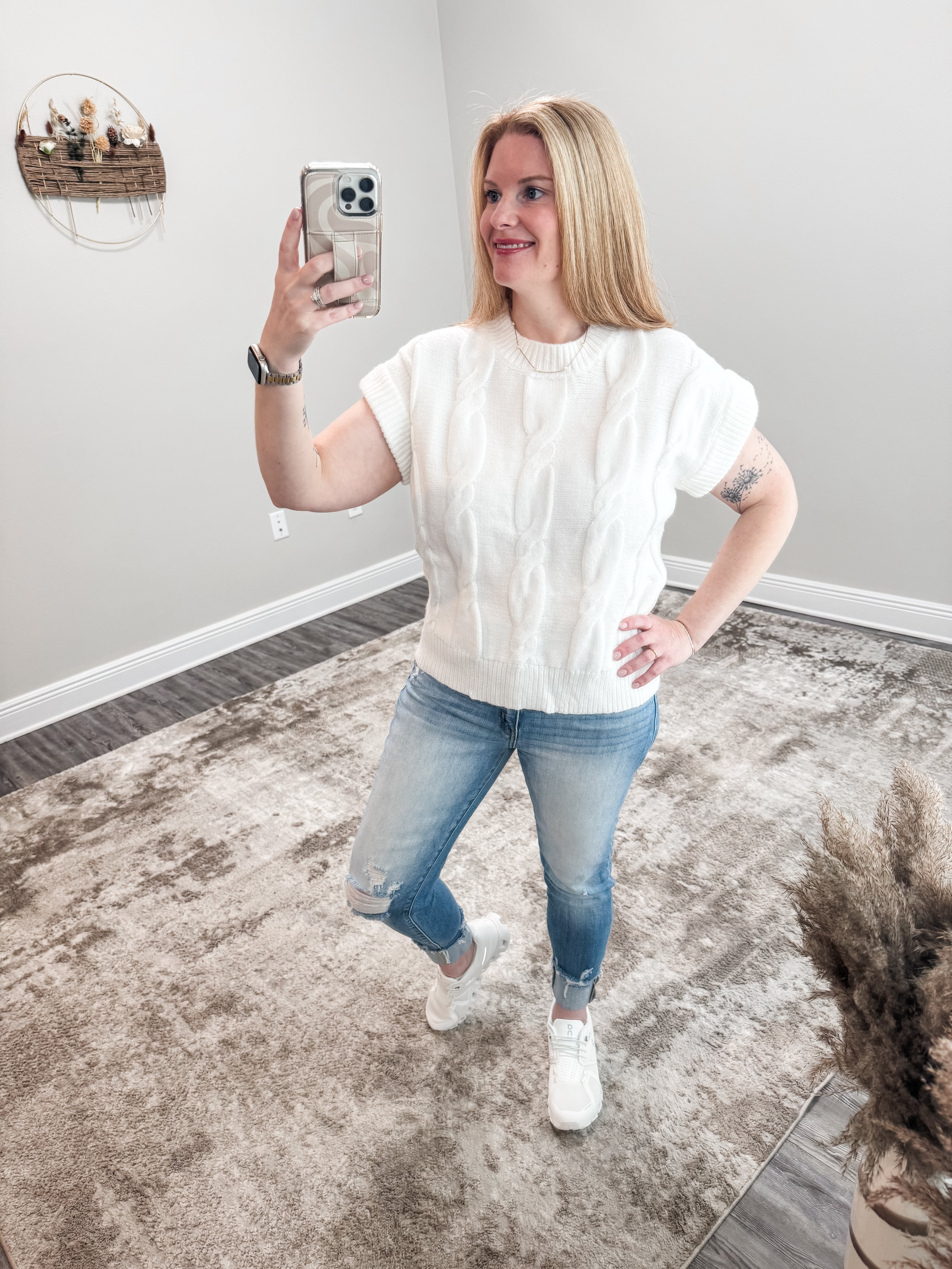 Introducing a classic cable knit short-sleeved sweater that effortlessly combines timeless style with comfort. This sweater features a textured cable knit pattern, adding a touch of sophistication and depth to your outfit. With its short sleeves and round neck, it offers a versatile look that can be easily layered or worn on its own, making it suitable for various occasions and seasons.