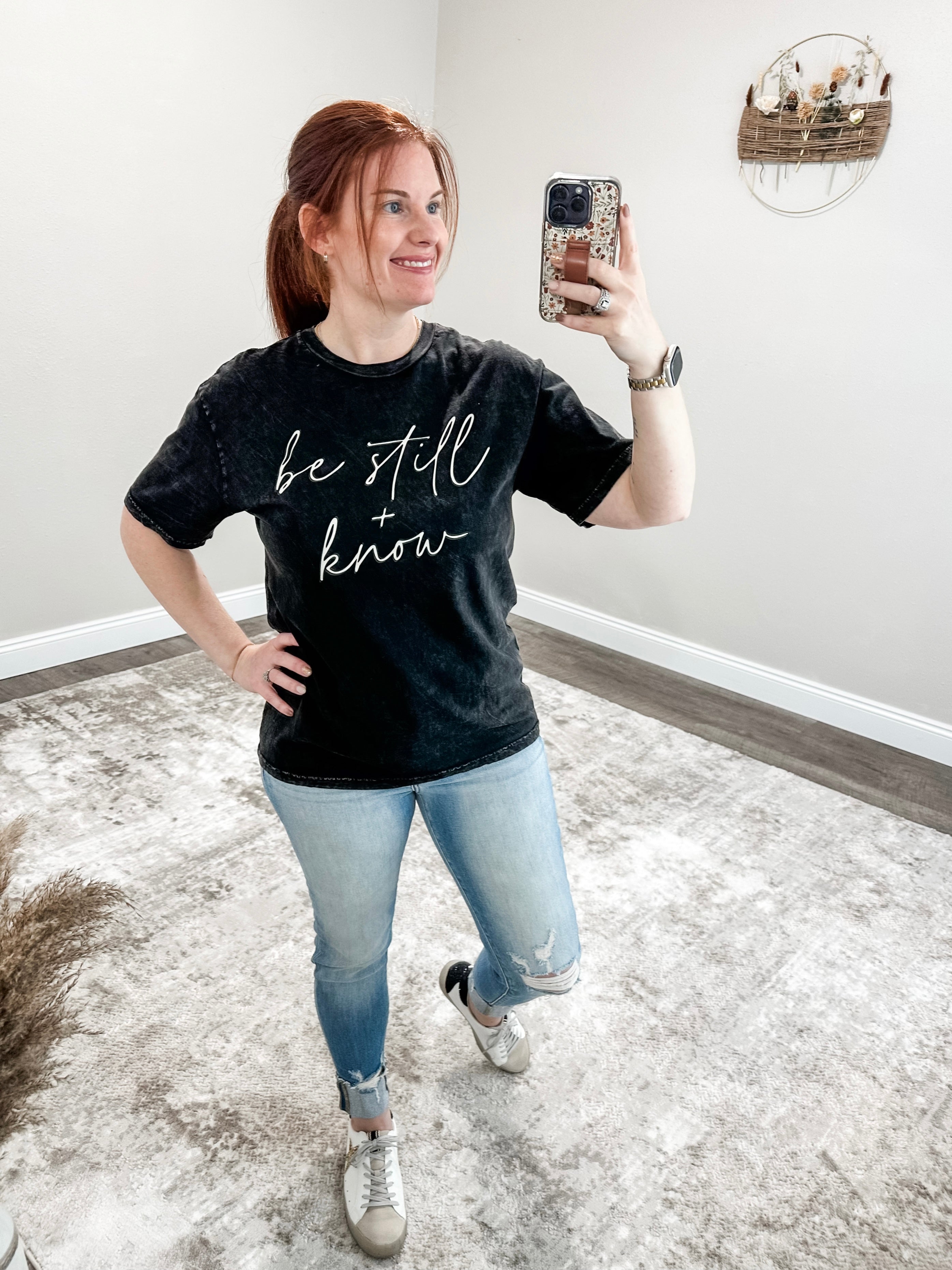 Made with premium cotton and a soft washed black color, our Be Still and Know tee is the perfect balance of style and comfort. Stay comfortable and stylish while spreading a positive message.