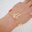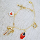 Add a playful touch to your jewelry collection with this charm bracelet featuring enamel strawberries, a delicate bow, a beaded heart, and more on a trendy gold-plated paperclip chain. Its 6.5" length with a 1" extender ensures a perfect fit, while the lead- and nickel-free finish offers comfortable, elegant wear. Perfect for layering or wearing solo, this bracelet brings a sweet, quirky charm to any outfit.