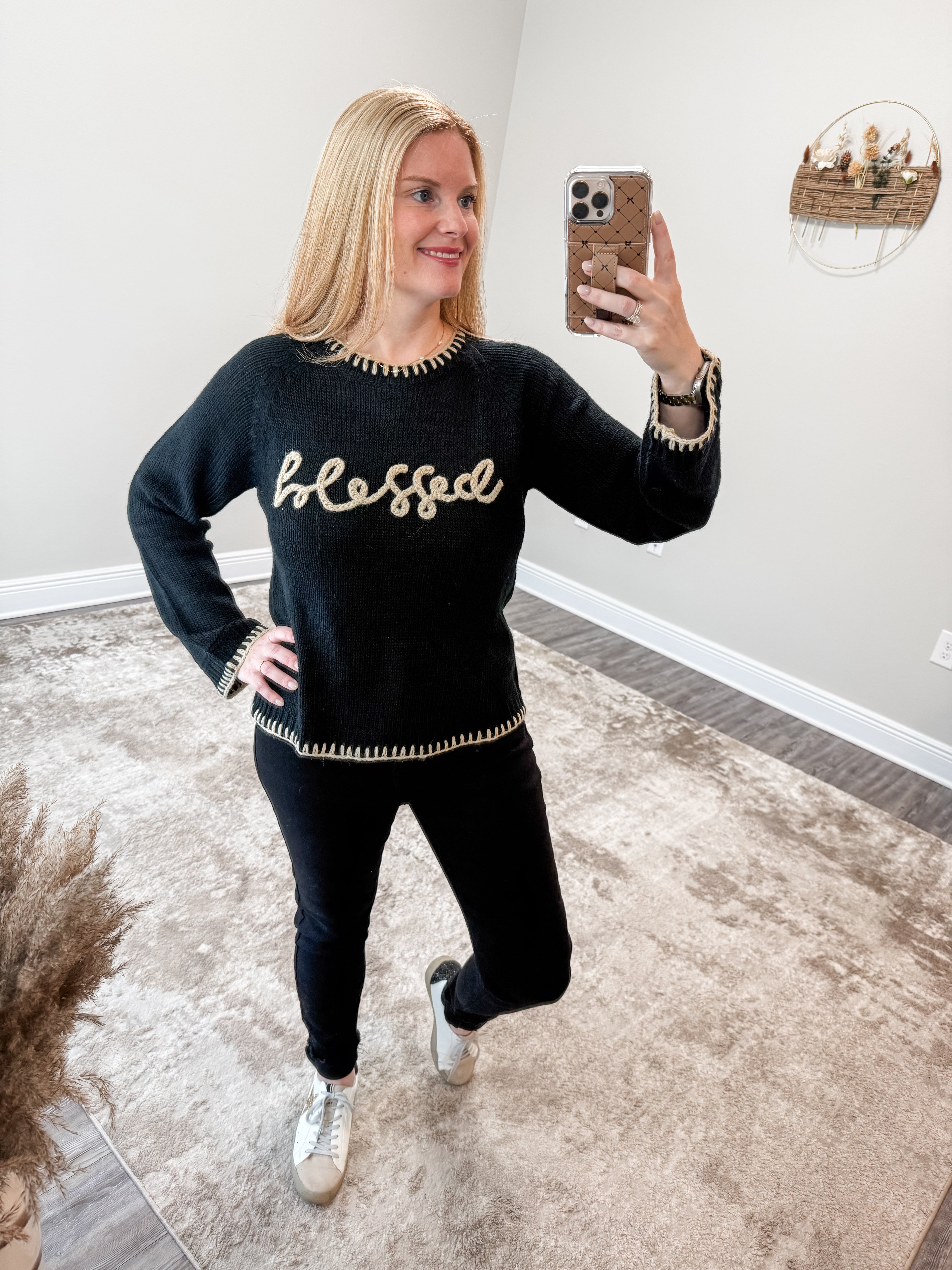 Unleash your inner positivity with our Blessed Sweater! The intricate blanket stitching and bold "Blessed" lettering adds a touch of unique style to this cozy sweater. Spread good vibes and feel confident while staying warm and stylish.