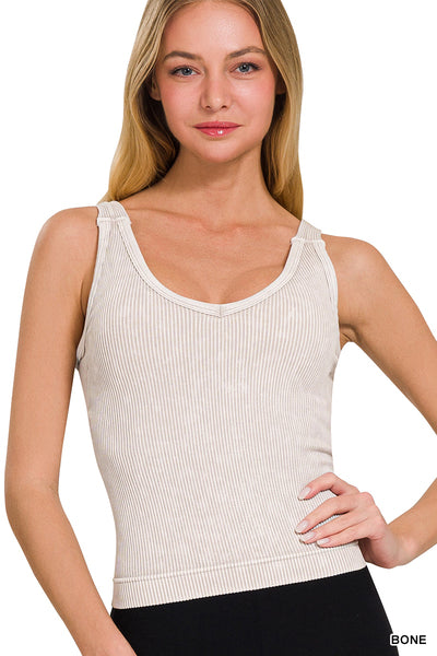 This mocha-colored cropped tank top features a ribbed design and v-neck, offering both style and comfort. Its removable bra pads provide customizable support. Made with high-quality materials, this top is perfect for everyday wear.