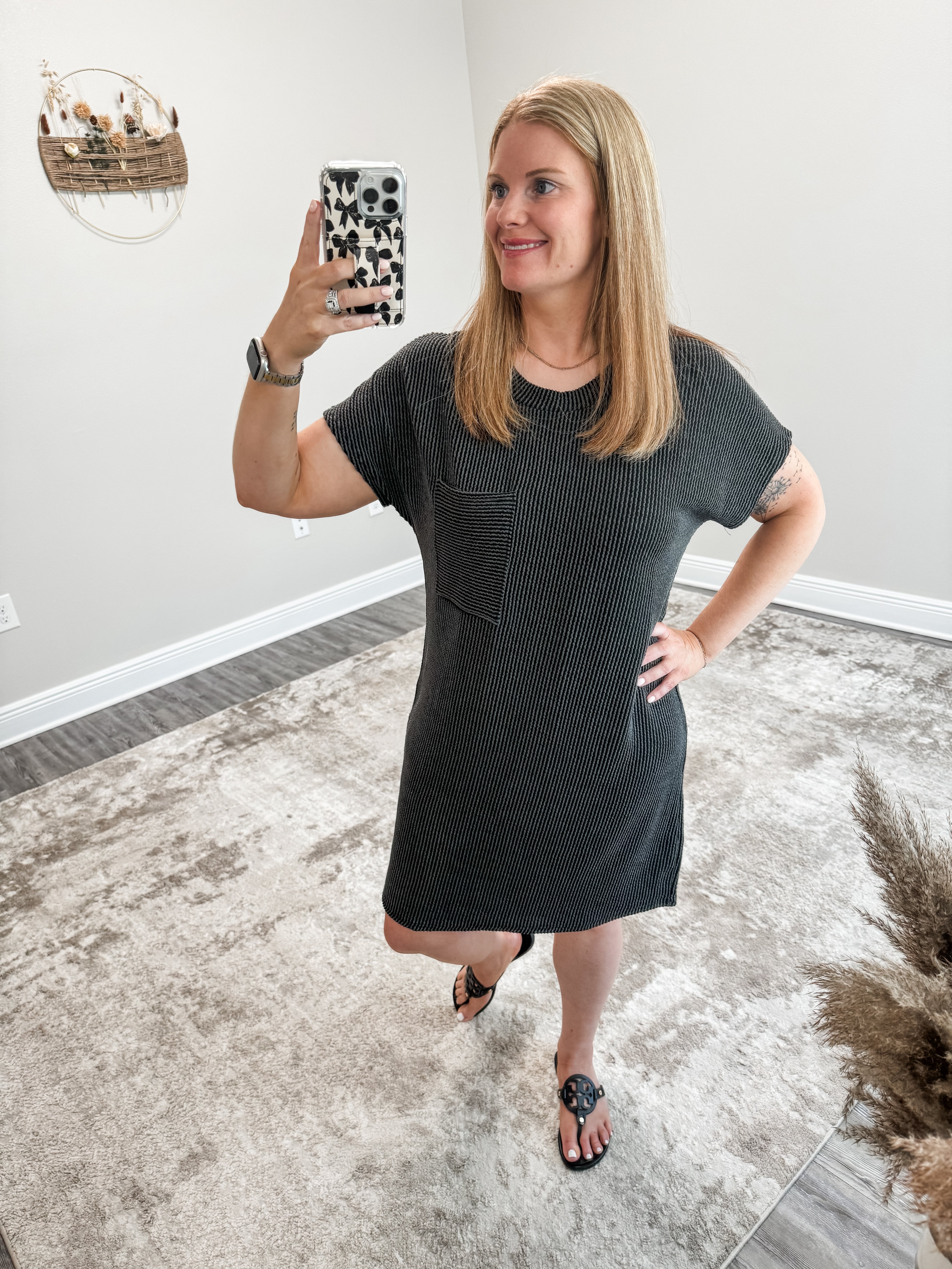Upgrade your wardrobe with our sleek and versatile ribbed round neck mini dress. Featuring a convenient pocket at the bust, this dress is both stylish and practical. The lightweight, non-sheer knit material creates a comfortable and effortless look. Perfect for any occasion, it's a must-have addition to your collection.