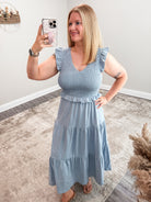 The Hannah Midi Dress combines effortless style with delicate details. Crafted from soft slub knit fabric, it features a flattering V-neck and charming short ruffle sleeves. The smocked bodice enhances comfort and fit, while the ruffle tier skirt adds playful movement. Its midi length makes it perfect for both casual outings and special occasions, offering a versatile and feminine look you'll love to wear.