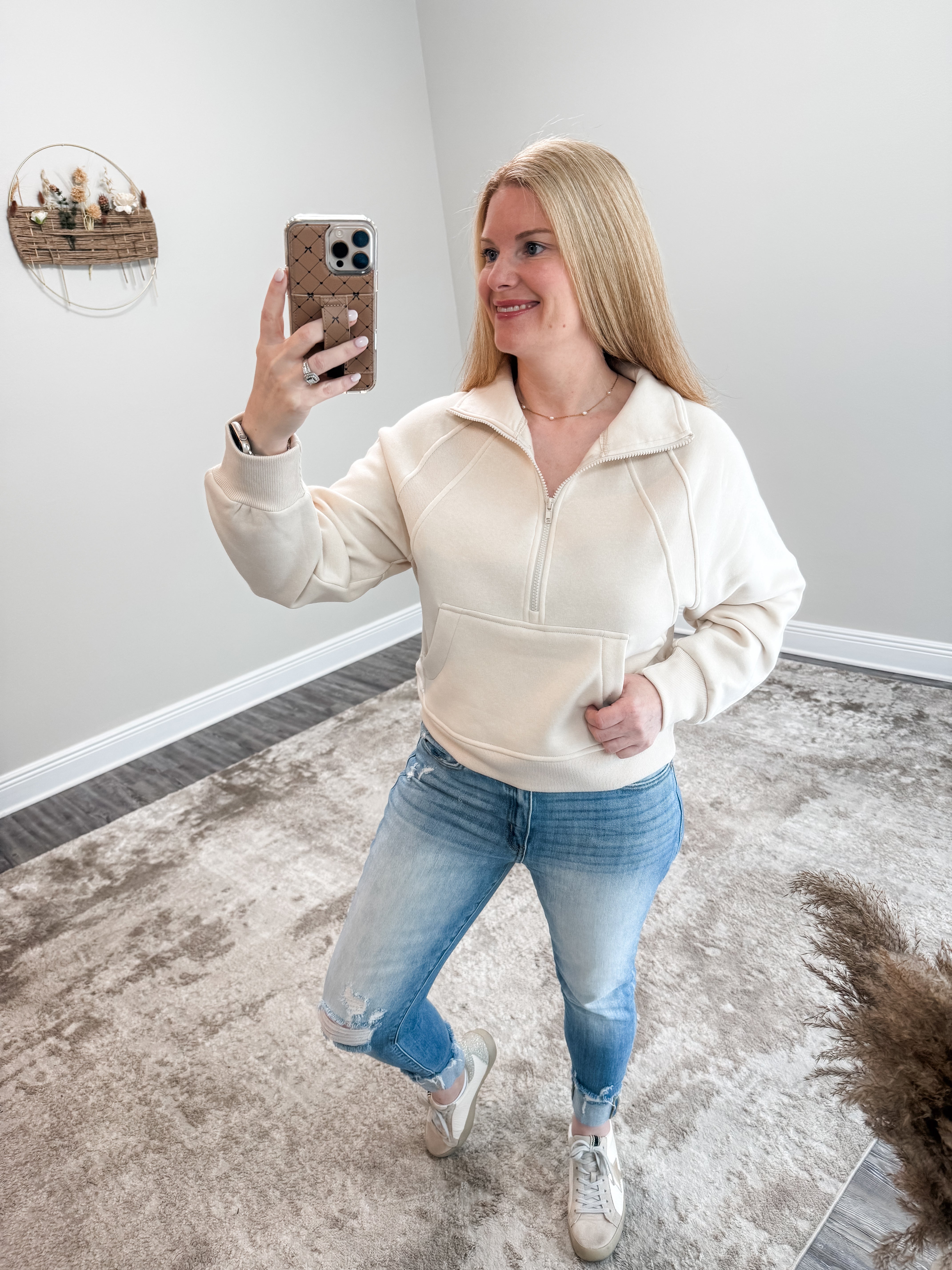 Introducing the Cream Miley Sweatshirt - the perfect combination of style and comfort. Made with soft fleece material, this sweatshirt features a convenient half zip and a spacious kangaroo pocket. Stay cozy and stylish in the Cream Miley Sweatshirt!