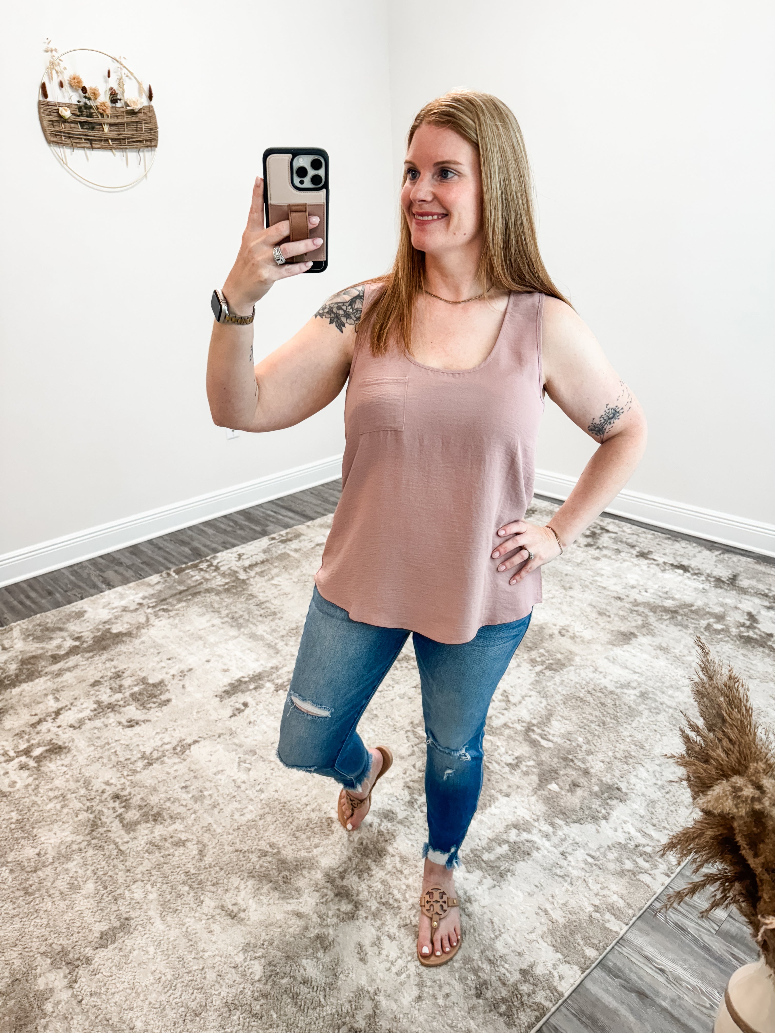 Expertly designed for layering, the Kinsley Scoop Neck Tank in Rose is a versatile and lightweight addition to your wardrobe. Featuring a trendy scoop neck and a convenient pocket, this blouse is perfect for transitioning between seasons. With a true-to-size fit, it's a must-have for any fashion-forward woman.