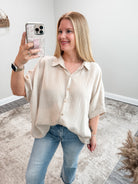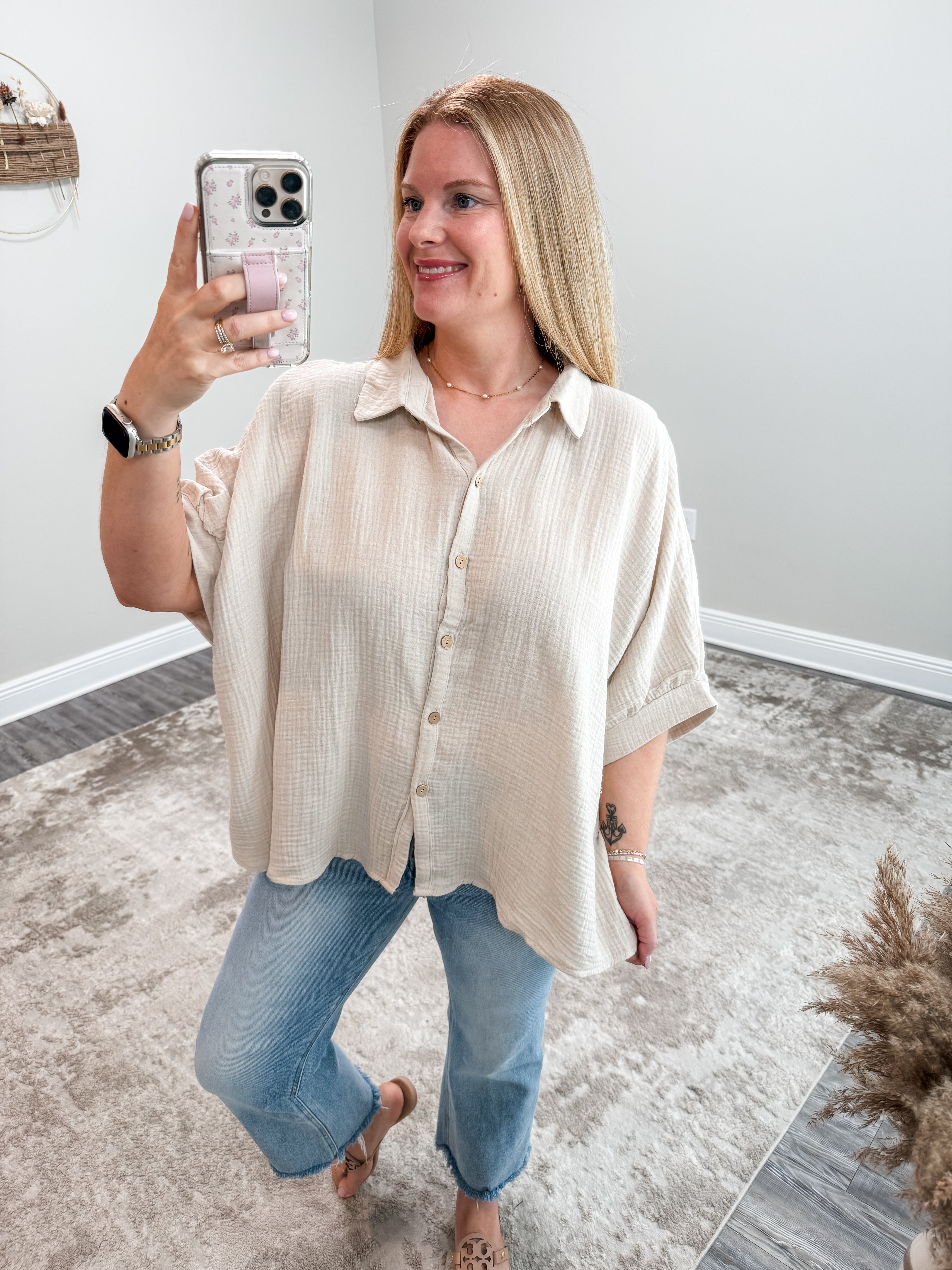 Experience effortless style with the Lucy Gauze Bubble Top. Crafted from lightweight gauze fabric, it features a charming collar detail and a convenient button-front closure. The oversized fit and dolman bubble sleeves create a flattering silhouette that moves with you. Easy to pull over, this top combines comfort and fashion for your everyday wardrobe.