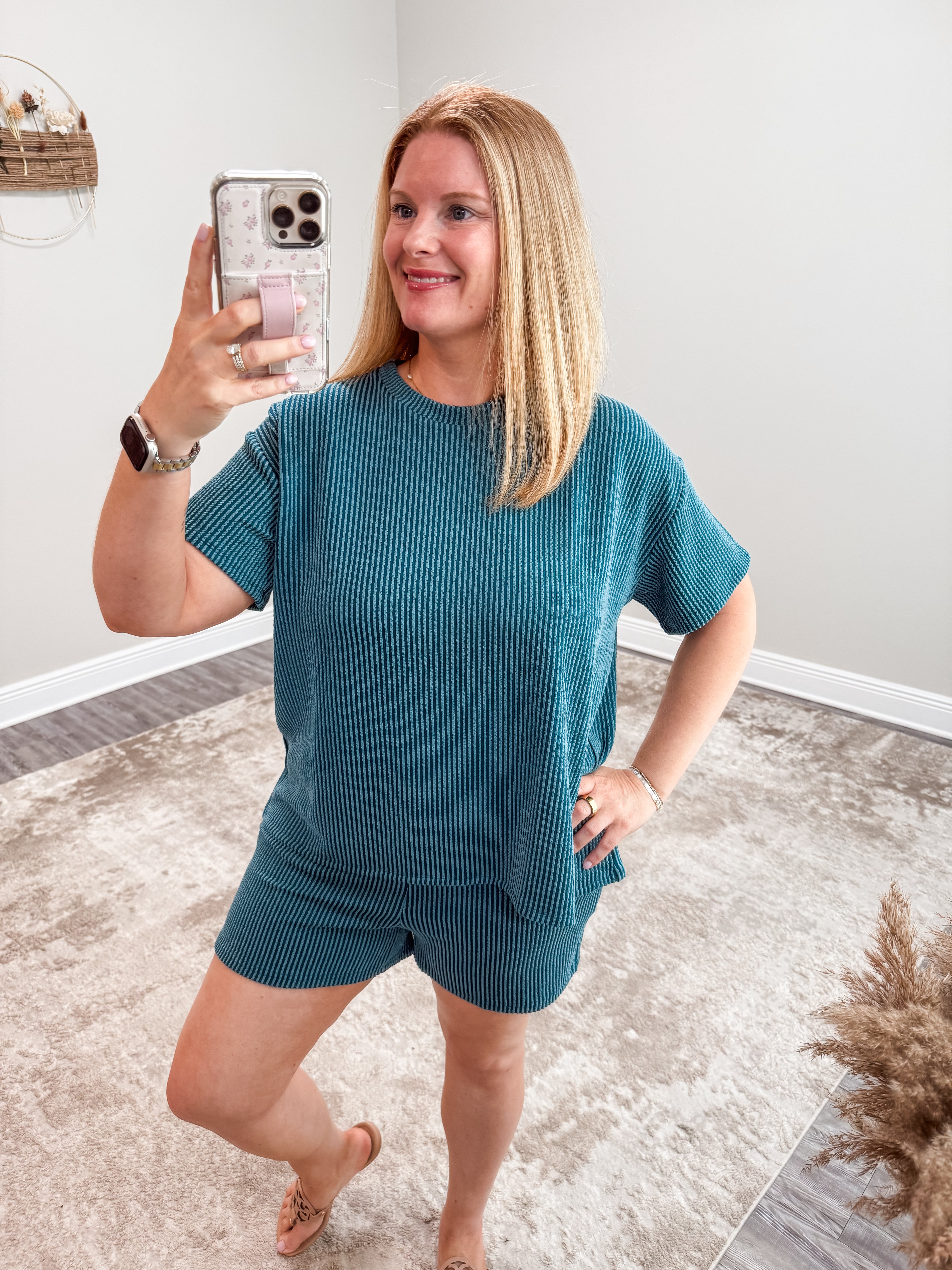 Experience ultimate comfort and style with the Maggie Ribbed Set in teal. Made with soft corded rib material, this set includes a short sleeve tee and shorts with a pocket for added convenience. The round-neck tee adds a touch of elegance to this casual ensemble. Upgrade your loungewear game now!