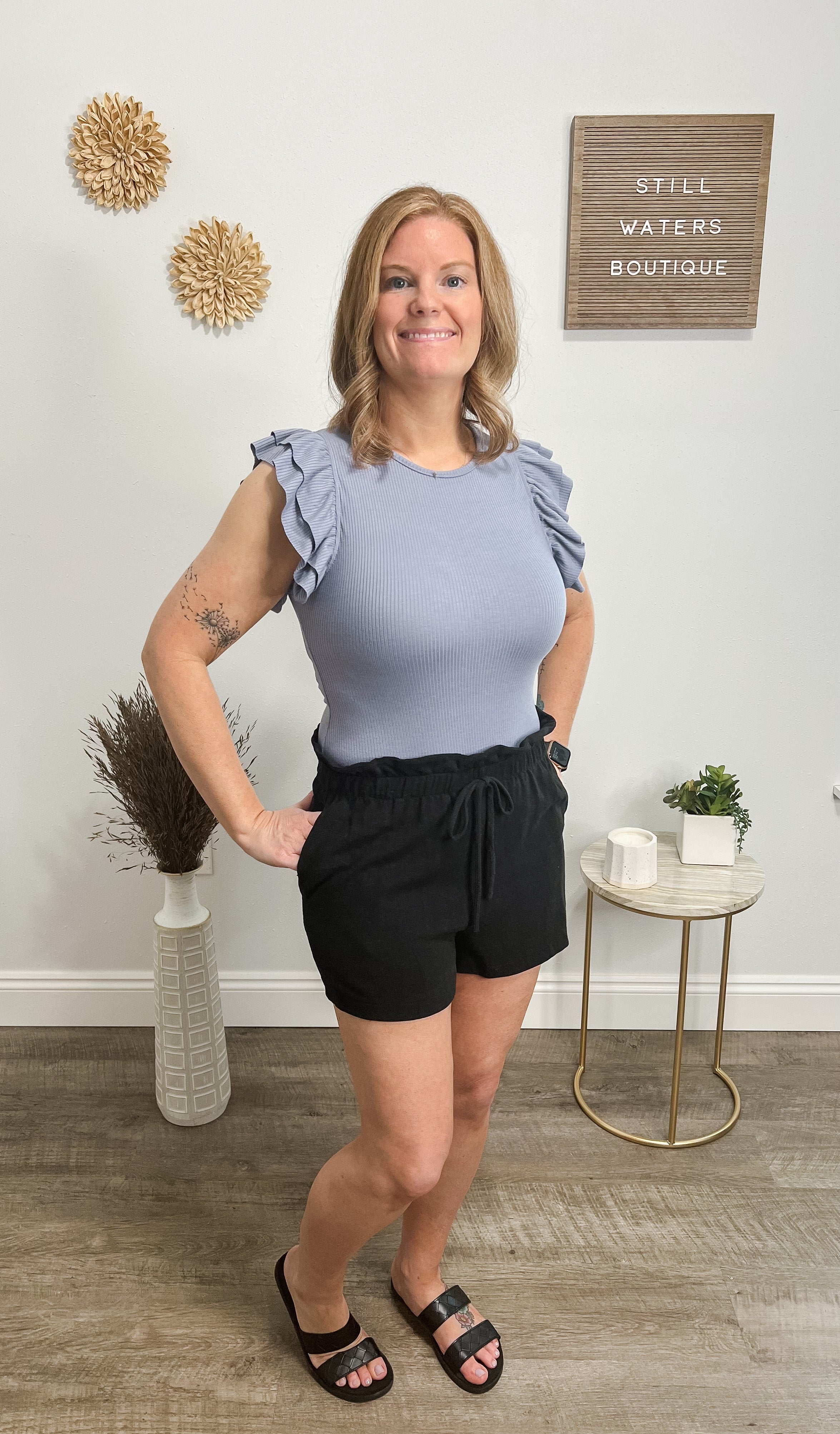 Casual and comfortable, featuring a paperbag elastic waistband, these black linen shorts are the perfect compliment for a warm summer day. Runs true to size. Wasabi + Mint Brand