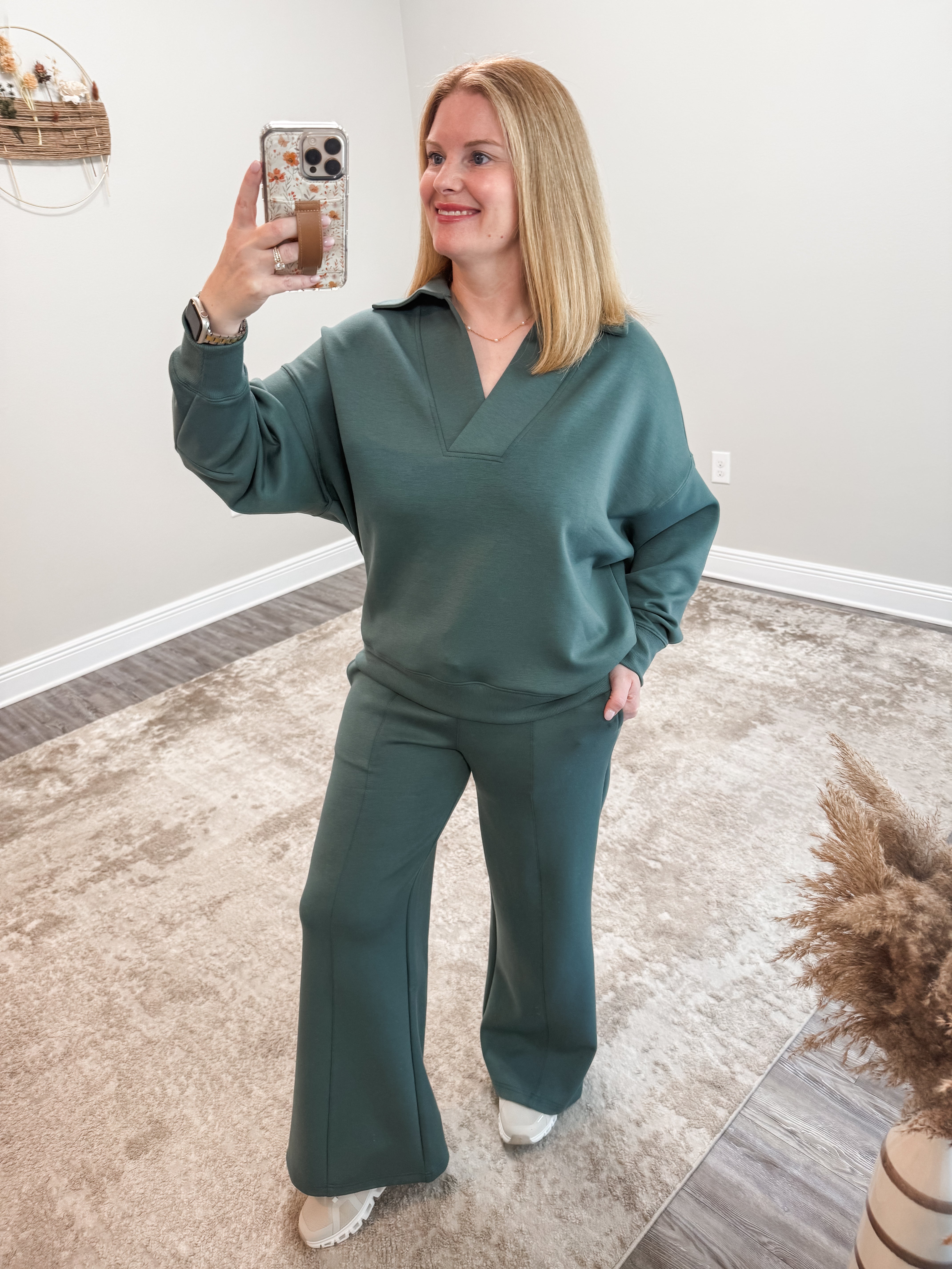 Refresh your wardrobe with the Nova Scuba Set in Jade. This versatile set features a deep V-collared pullover that creates a flattering silhouette, paired with drawstring pants designed for comfort and practicality, complete with convenient pockets. Perfect for effortless style whether you're at home or on the go, this set combines modern design with everyday functionality.