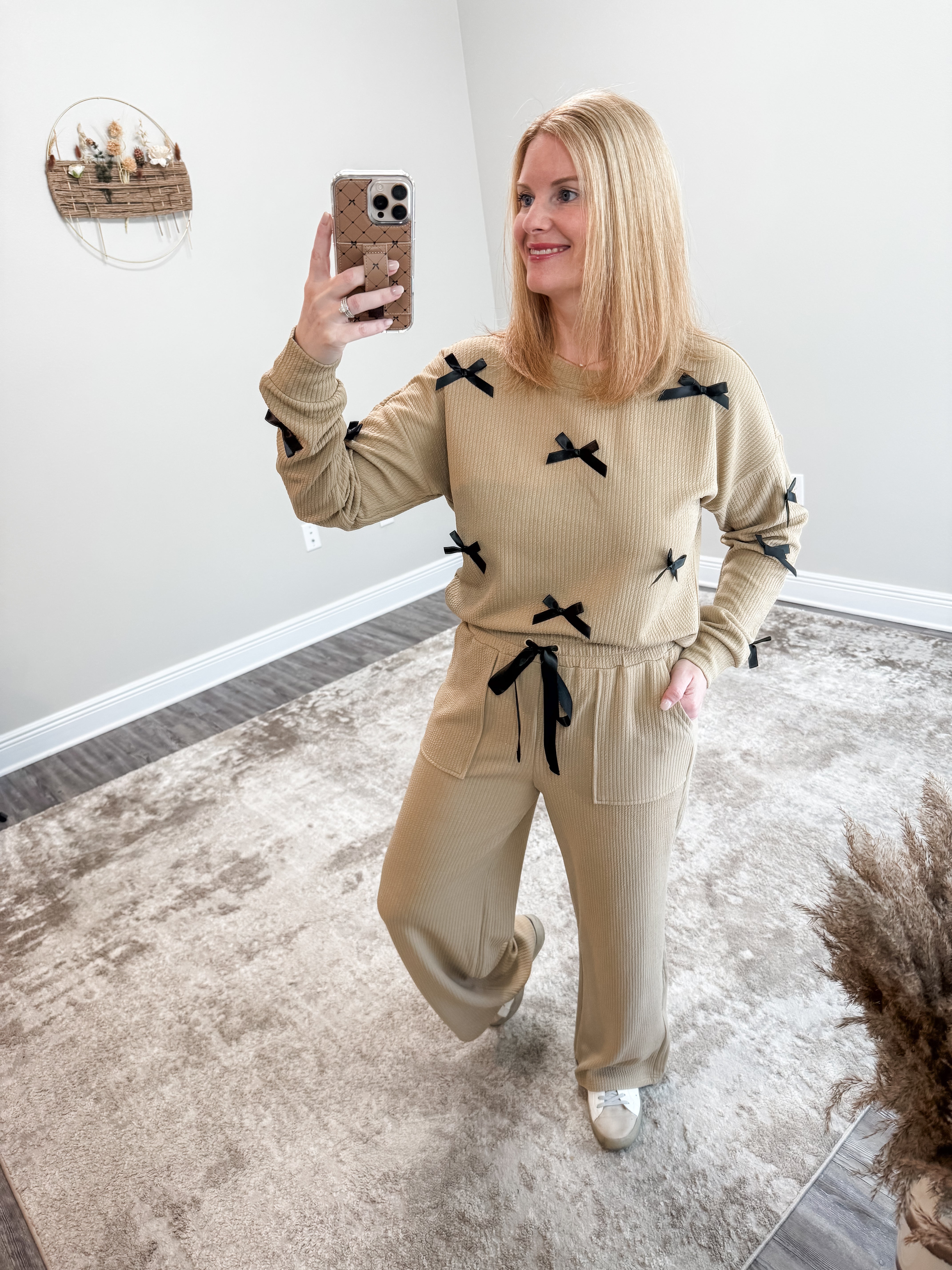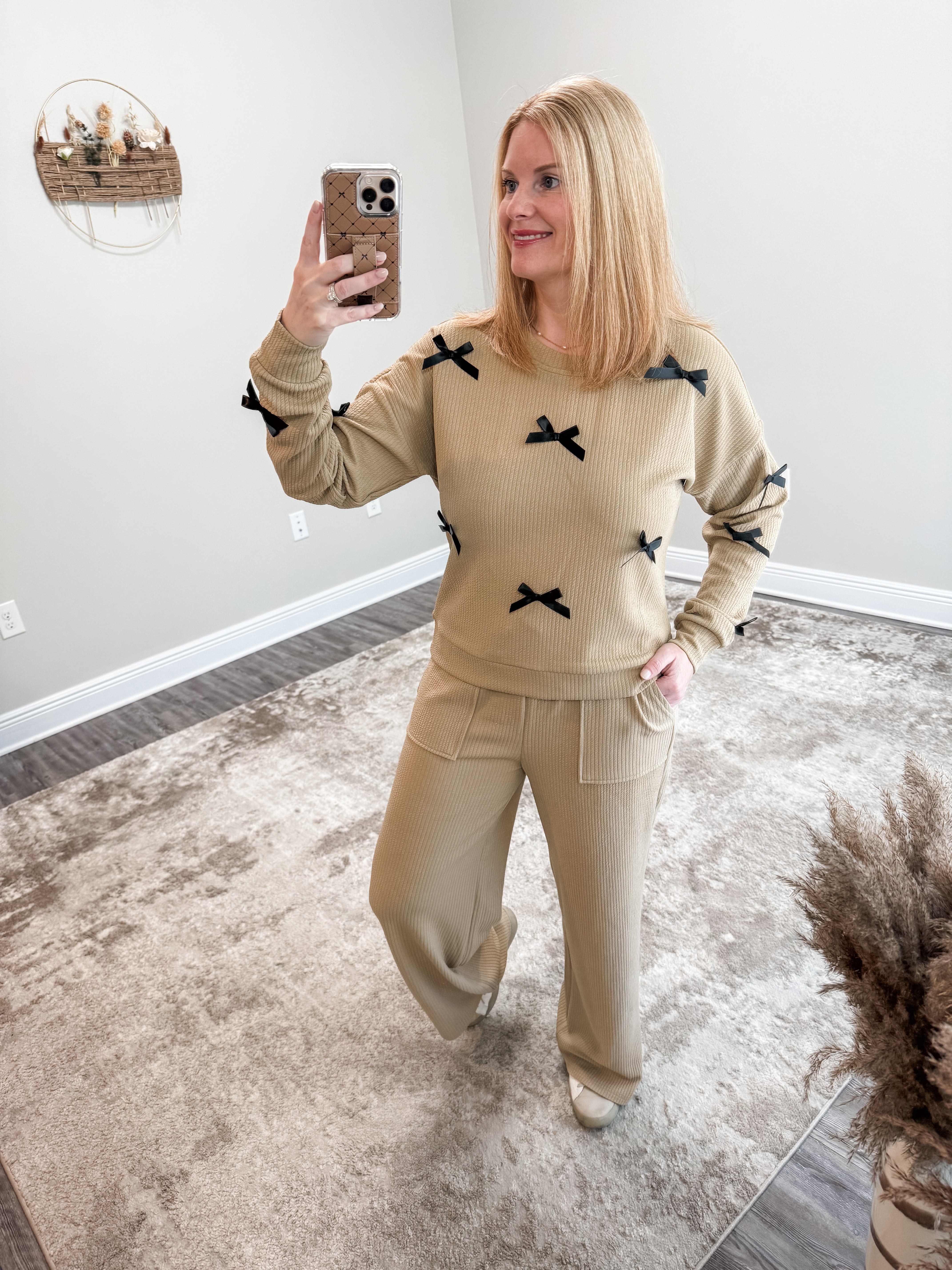We love our Peyton Bow Set! The solid long sleeve top features 3D bow detailing, rounded neckline, banded cuffs, and a ribbed texture. The solid pants have an elastic waistband, pull drawstring with ribbon tie, and two side hip pockets. Feel confident and chic in this cozy and stylish set.