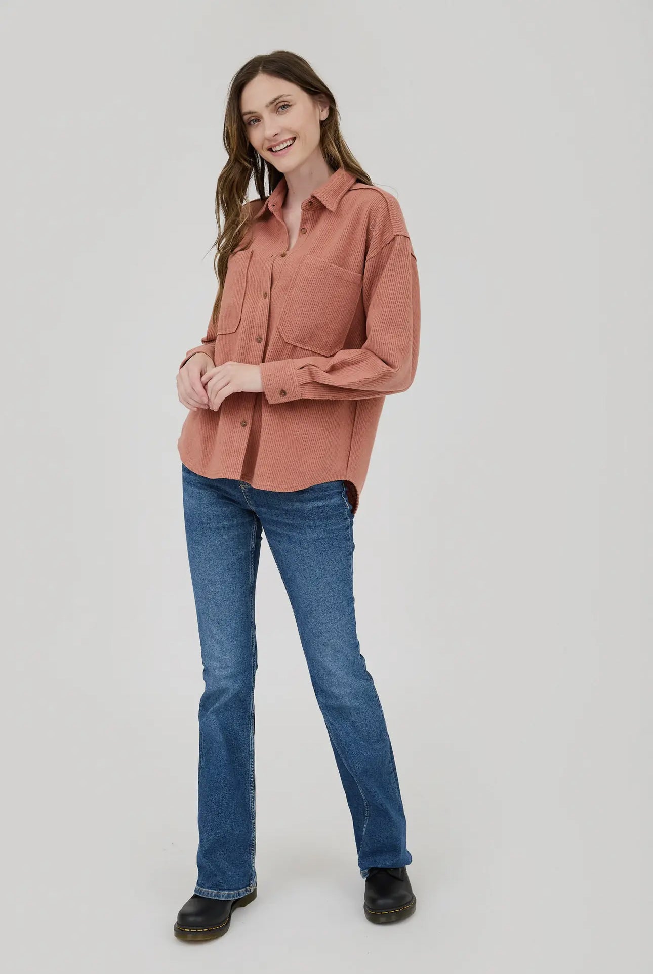 The Ribbed Knit Shacket in Teracotta truly has it all! Featuring a classic collared design with a stylish button-down front, long sleeves with buttoned cuffs, and exposed seam detailing for added texture. The unique U hem and back yoke detail add an extra touch of personality. Plus, the rib knit top is ultra-comfortable for all-day wear. Elevate your wardrobe with this versatile and trendy shacket!