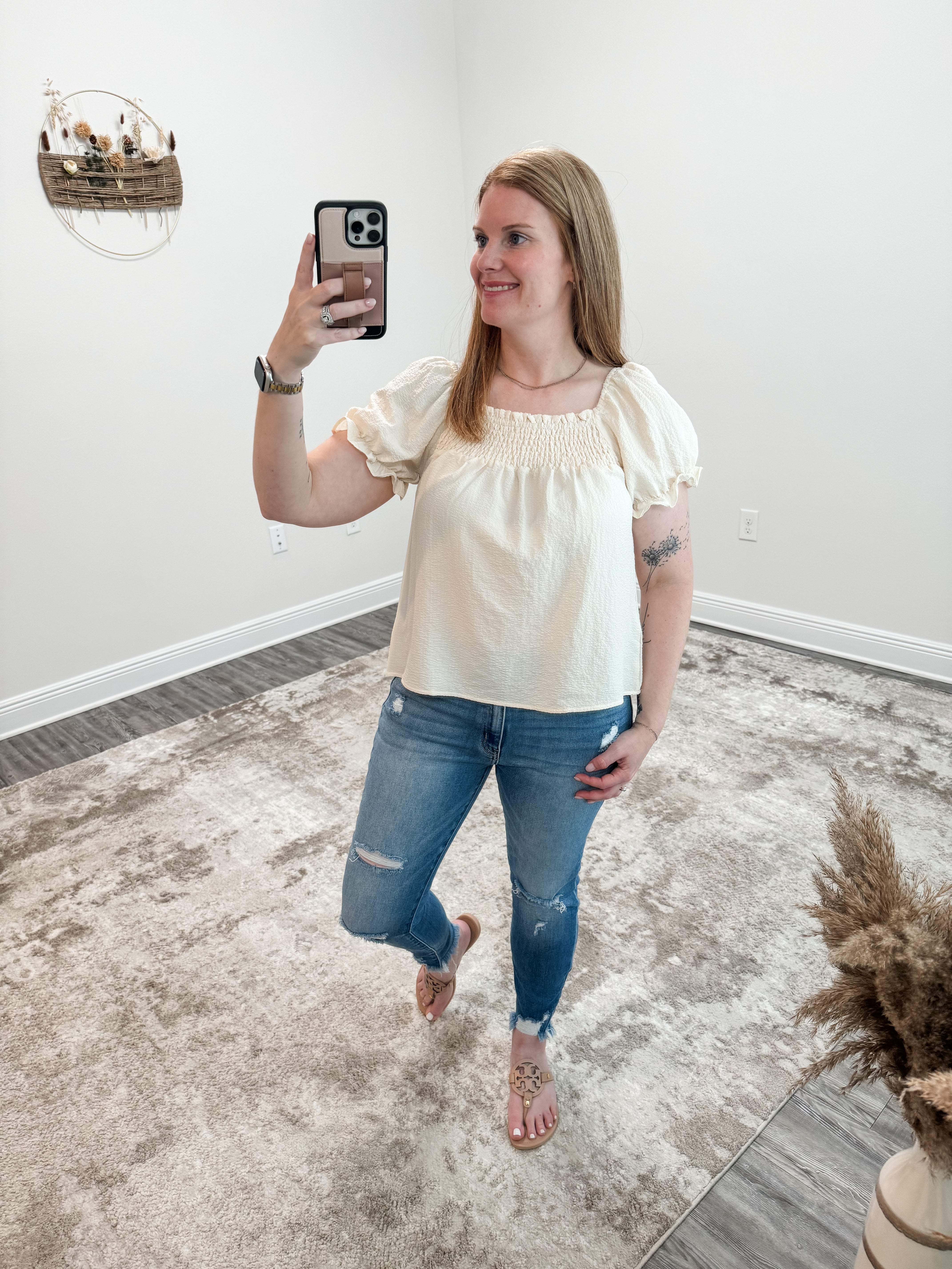 The Sophia Textures Top is made from a durable woven fabric that adds visual interest to your outfit. Its flattering square neckline and smocking detail on the front and back create a structured and stylish look. The short puff sleeves with ruffle add a touch of whimsy.