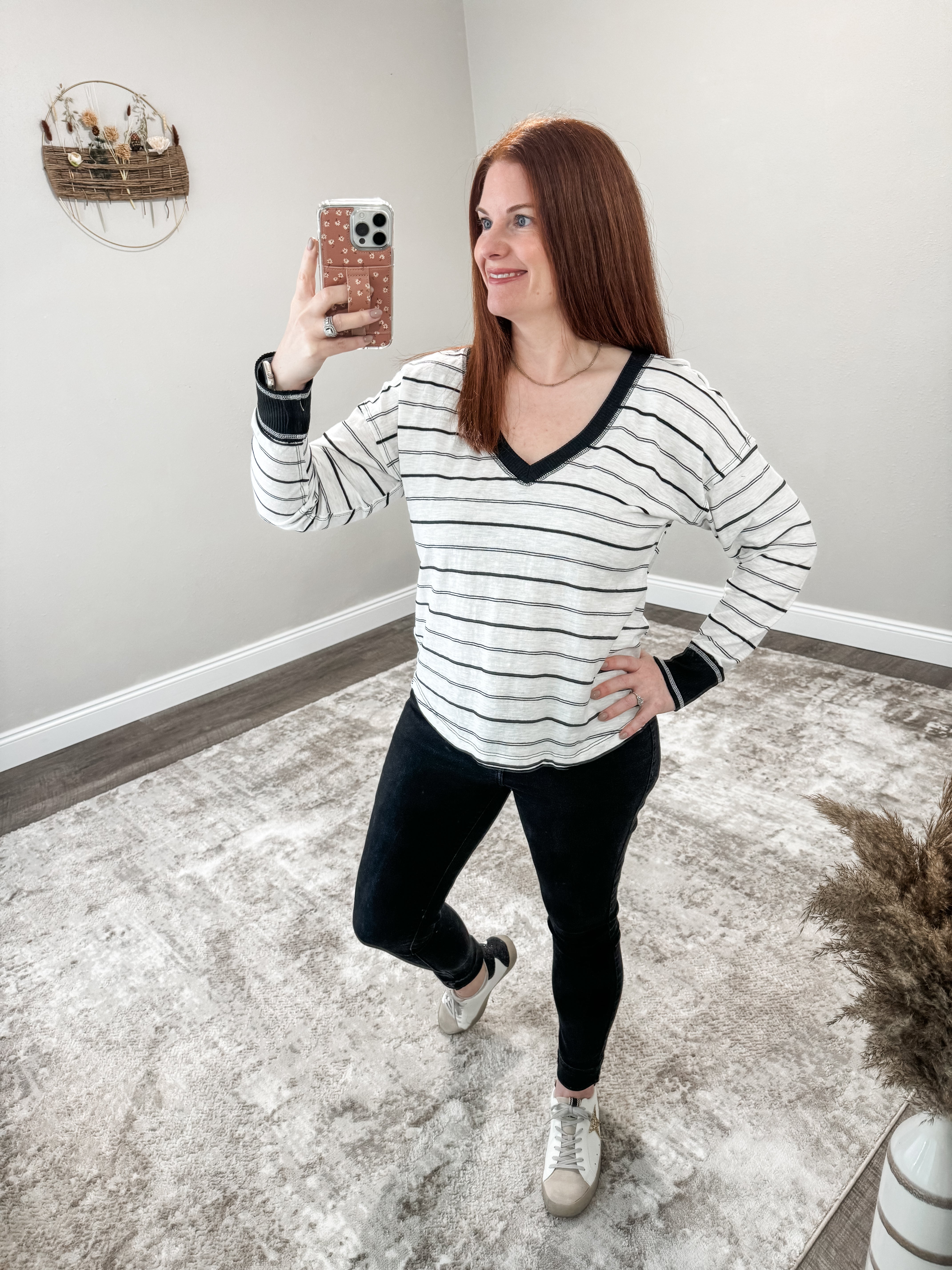 This White and Black V-Neck Top features a subtle contrast of colors with a black v-neck and cuff of sleeves, adding a touch of elegance and sophistication to the classic white top. Made with high-quality materials, it offers both comfort and style. Perfect for any occasion, this top is a versatile addition to your wardrobe.