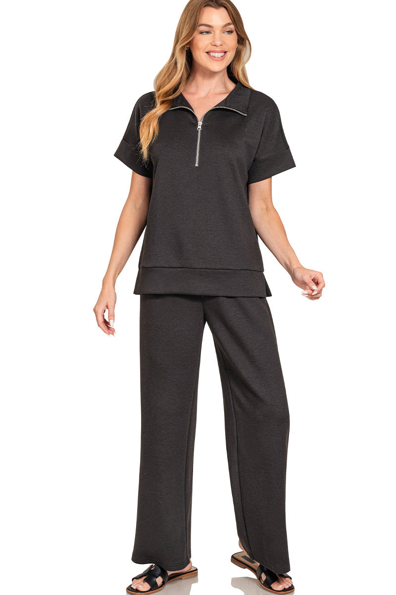 Discover comfort meets style with the Harper Set in black—a chic two-piece collection that transitions seamlessly from day to night. The high-neck half-zip top features a relaxed silhouette, while the matching wide-leg pants offer an elevated look with practical side pockets and an easy elastic waistband. Made from soft scuba fabric, this set provides the cozy feel you crave without sacrificing sophistication. Perfect for layering or wearing solo, the Harper Set is your go-to choice for effortless, polished everyday wear that keeps you feeling confident and comfortable.
