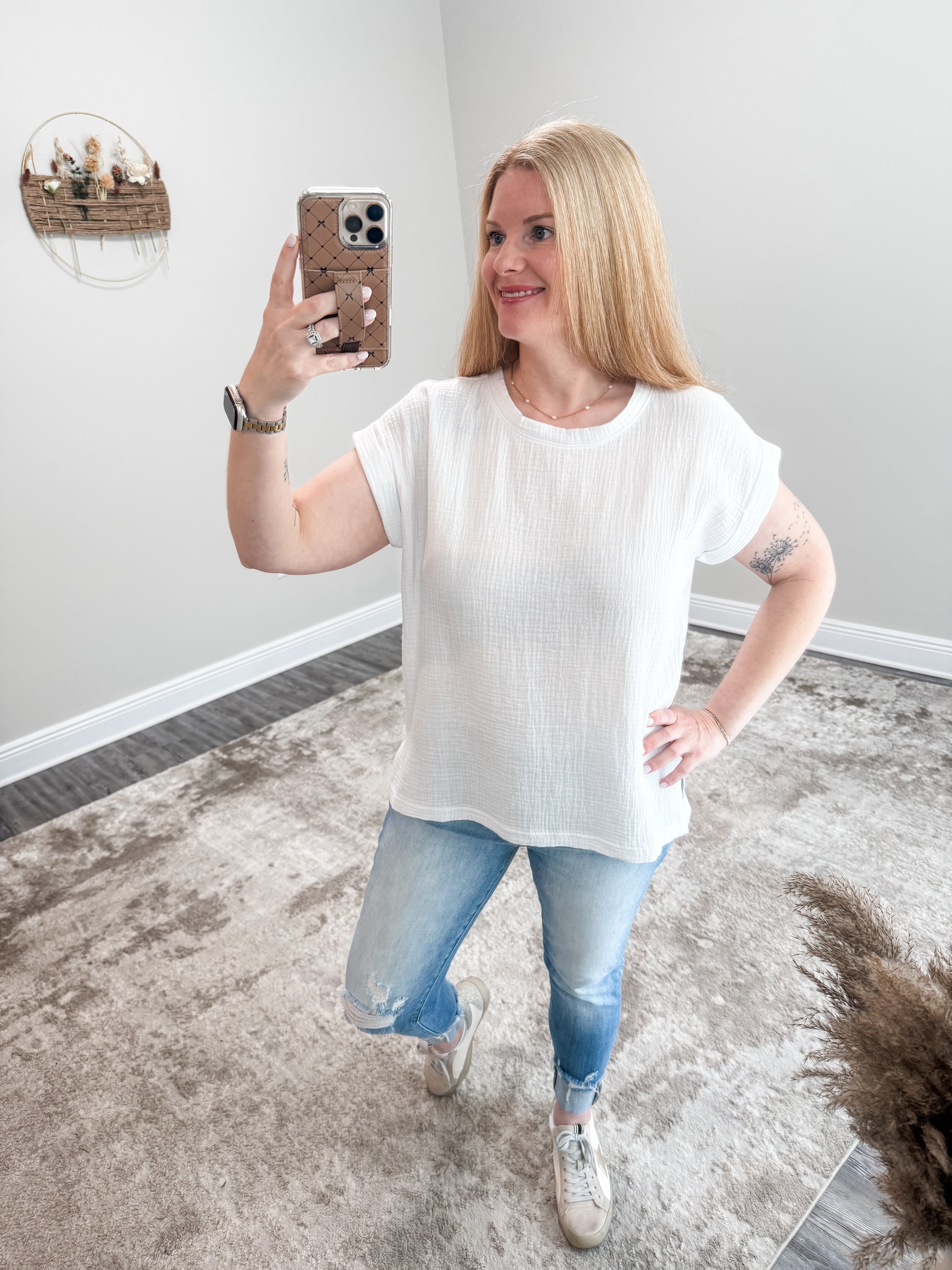 Stay cool and comfortable in the Macie Top. Made with double gauze fabric, it features a round neck, folded short sleeves, and side slits for a modern twist. The hi-low hem adds a stylish touch to this versatile top. Perfect for any occasion, feel confident and stylish in the Macie Top!