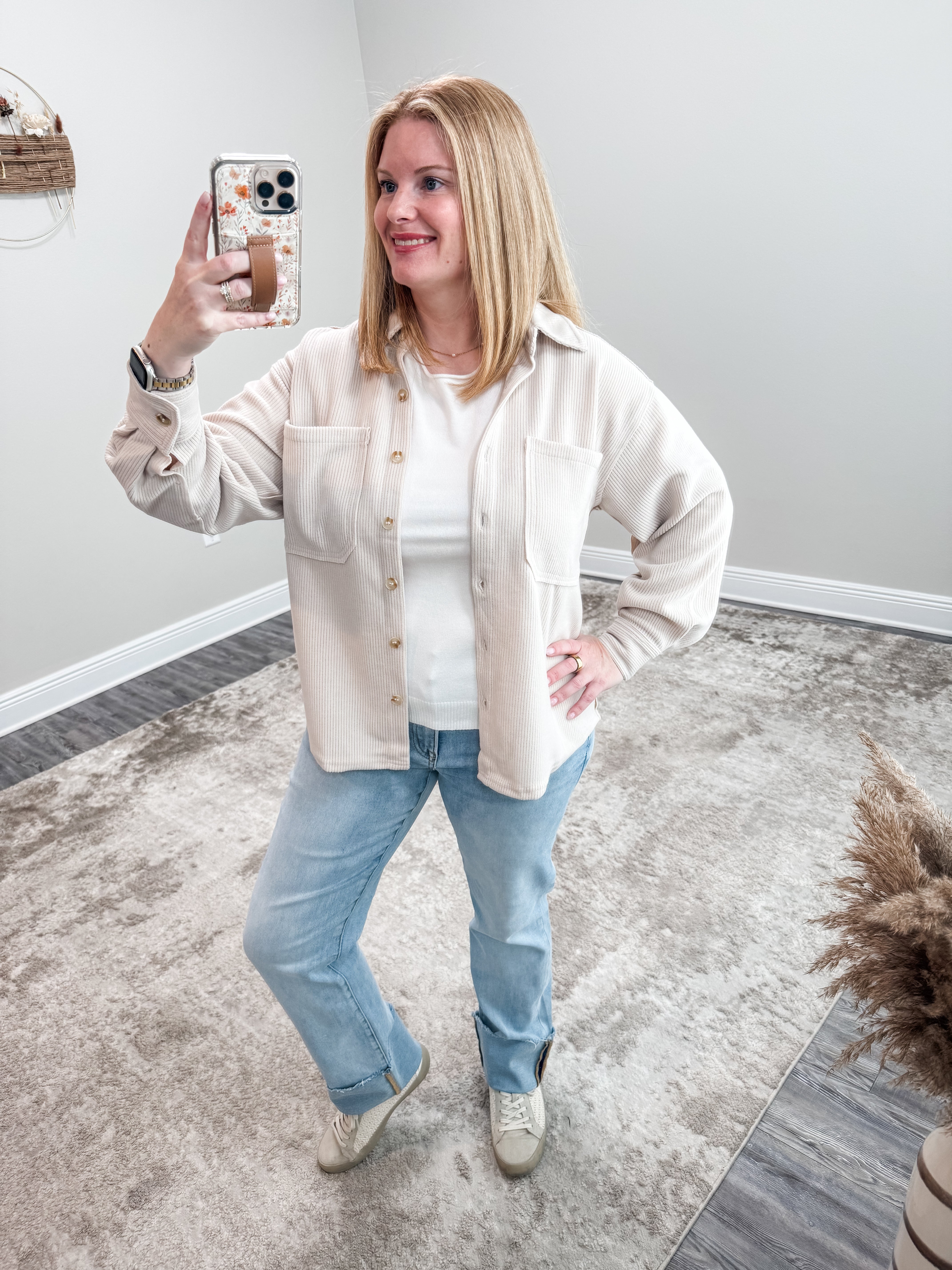 The Ribbed Knit Ivory in ivory truly has it all! Featuring a classic collared design with a stylish button-down front, long sleeves with buttoned cuffs, and exposed seam detailing for added texture. The unique U hem and back yoke detail add an extra touch of personality. Plus, the rib knit top is ultra-comfortable for all-day wear. Elevate your wardrobe with this versatile and trendy shacket!