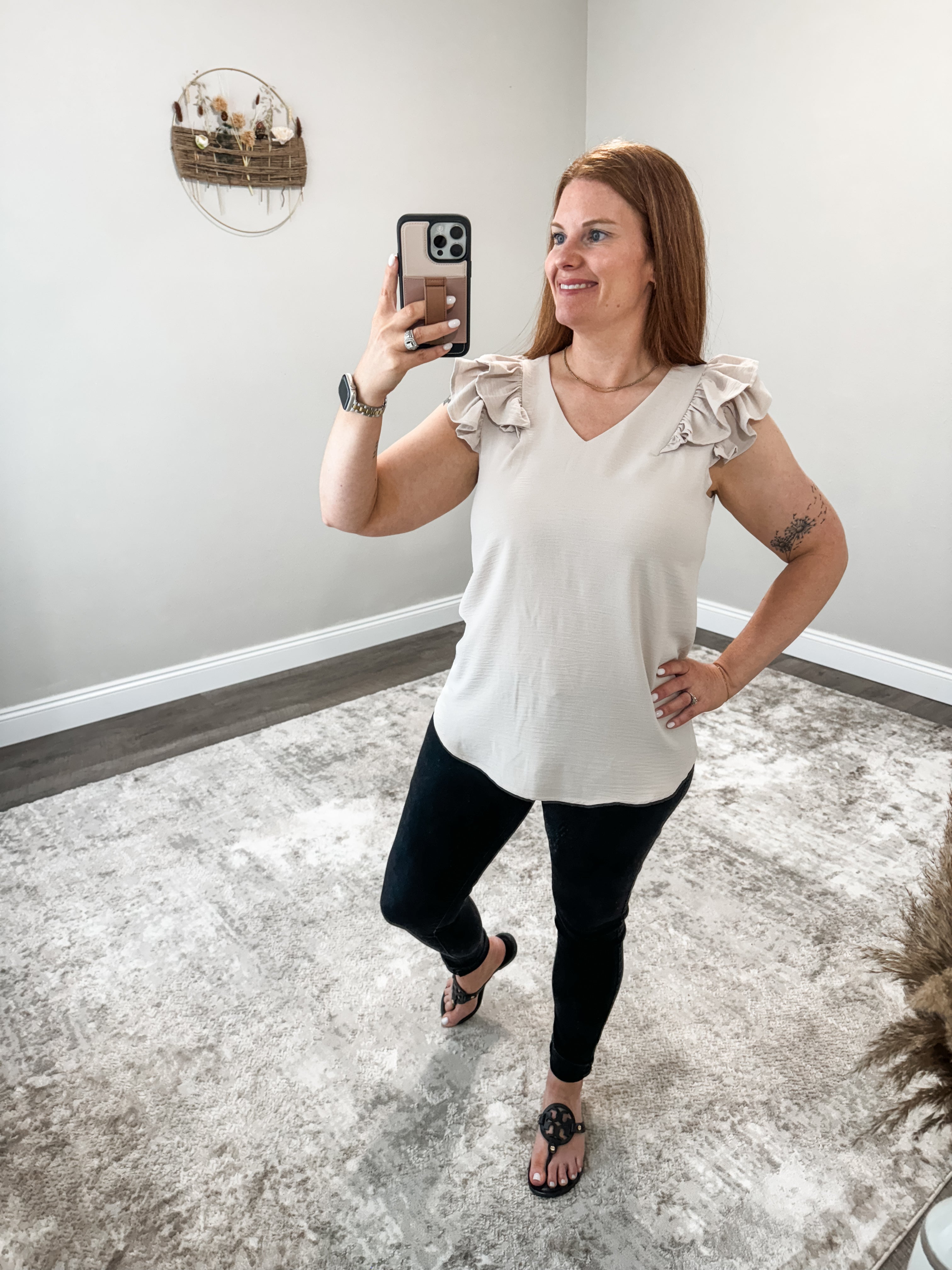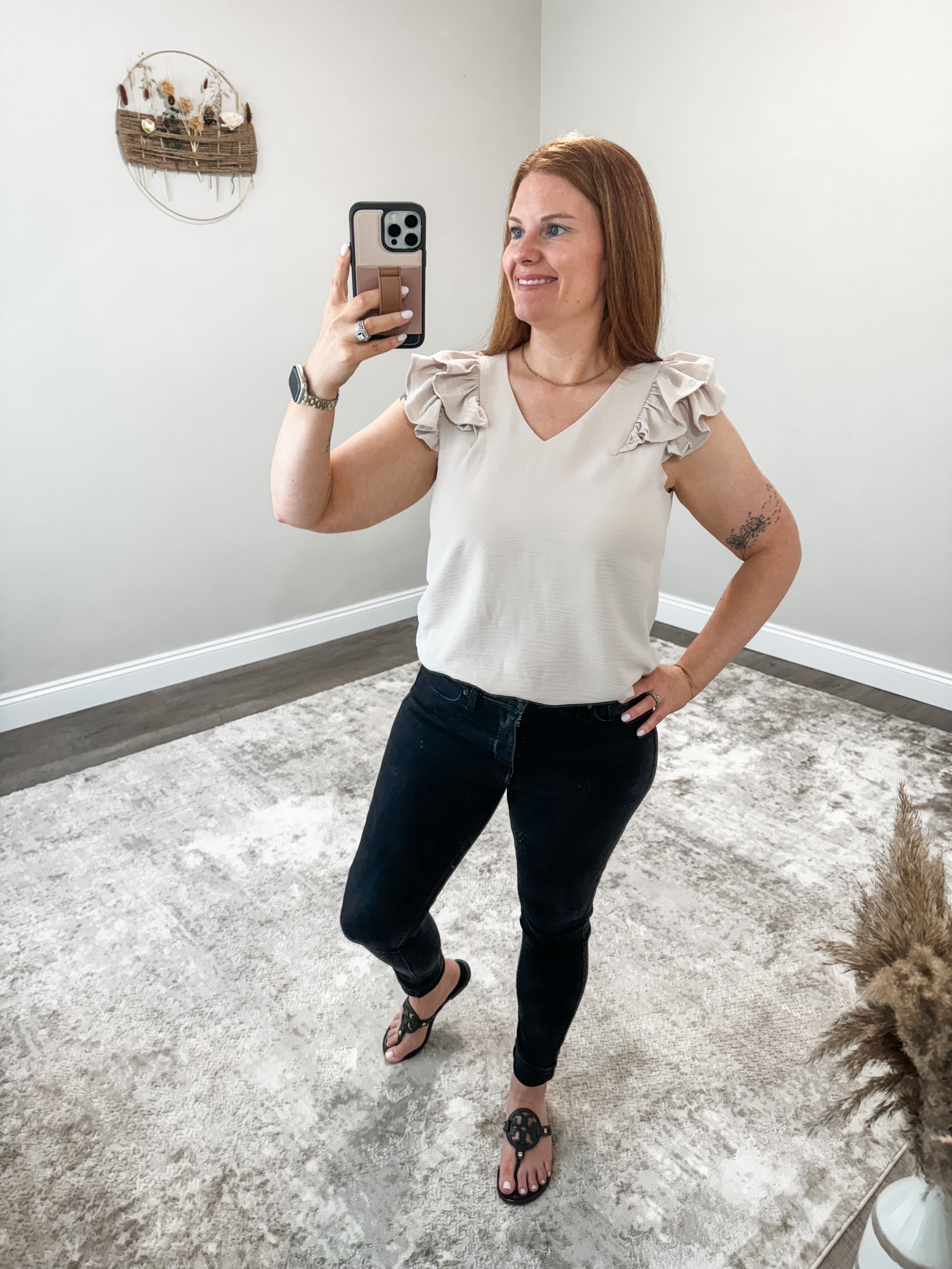Introducing the Everly Ruffle Blouse, a stylish addition to your wardrobe. With airflow ruffle sleeves, this blouse offers a chic touch while also allowing for comfortable wear. Perfect for any occasion, its elegant design will elevate any outfit. Look effortlessly put-together with this must-have blouse.