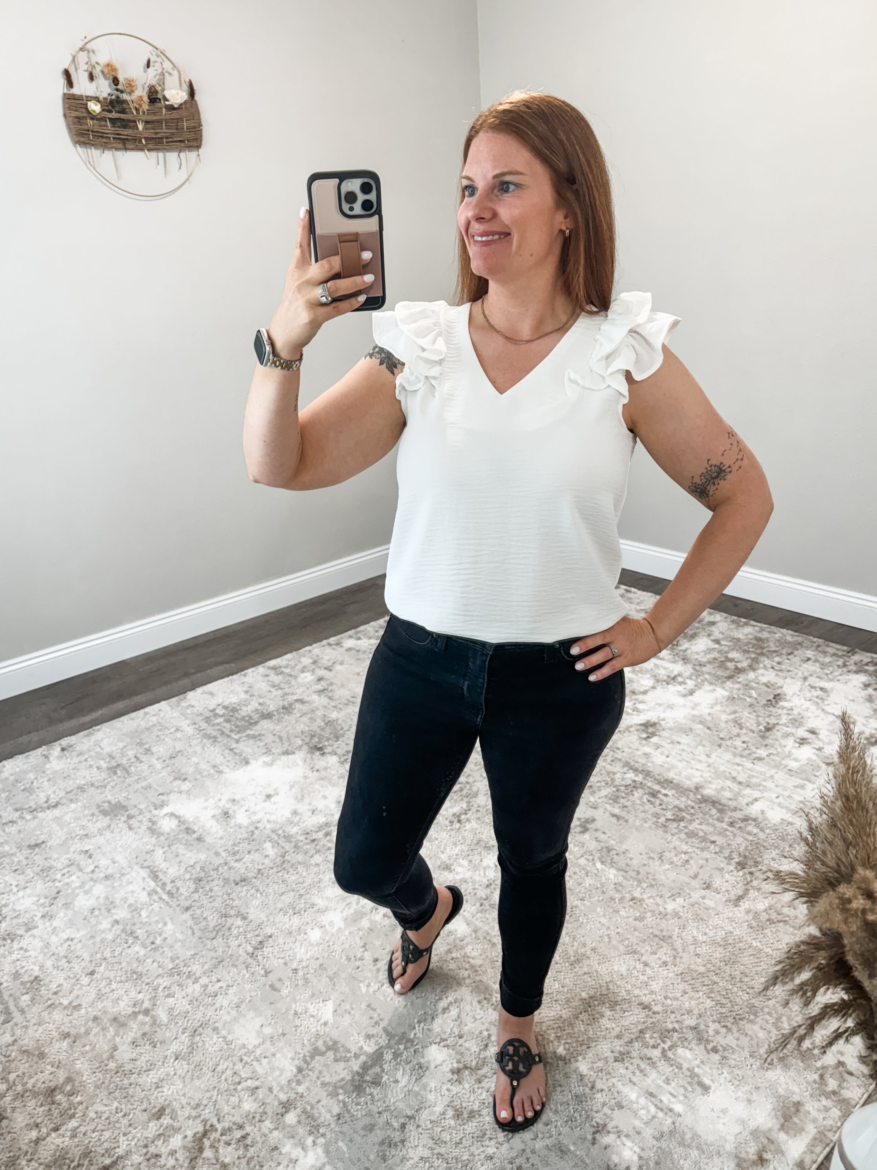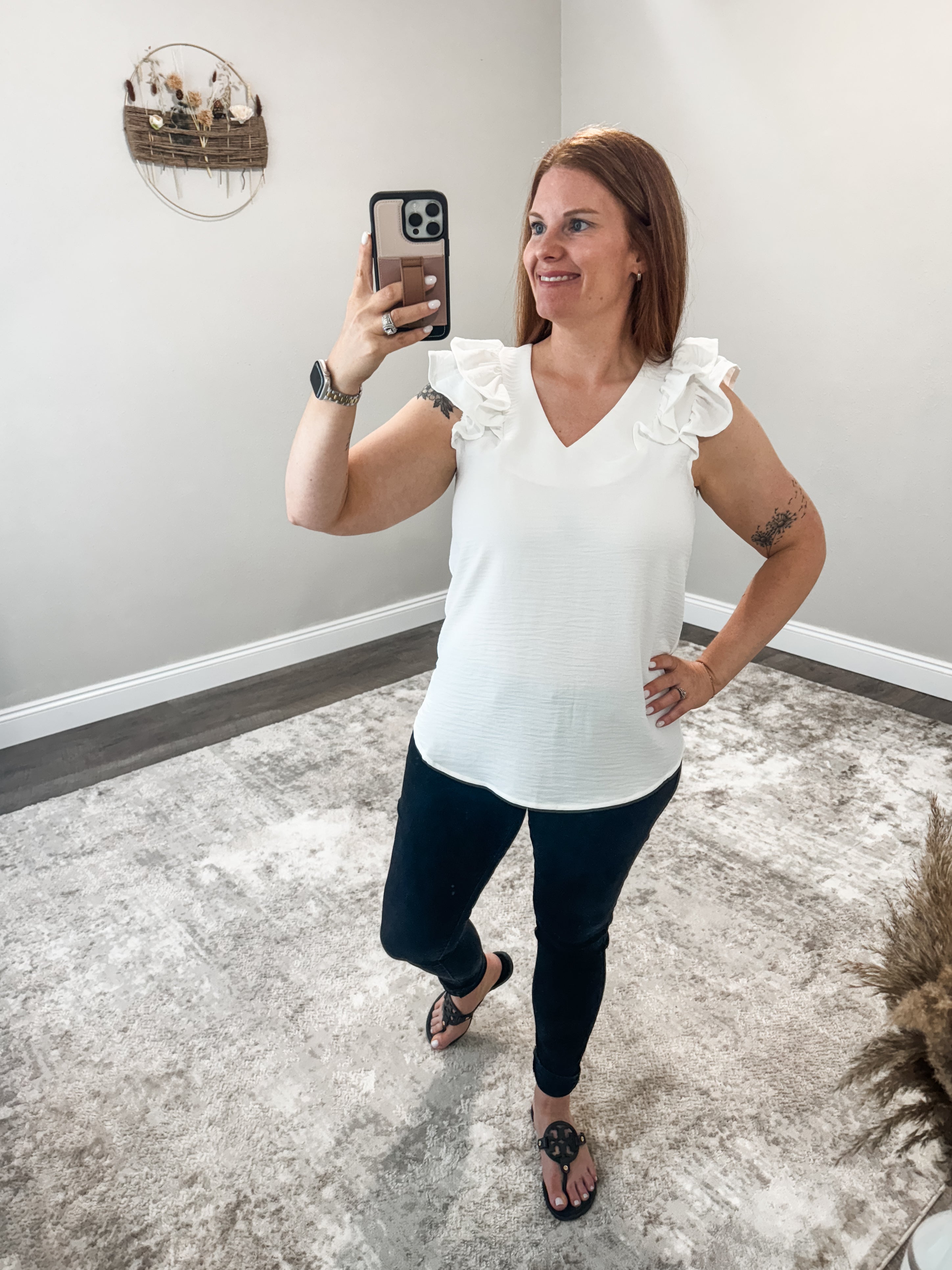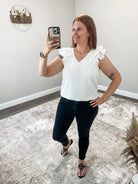 Introducing the Everly Ruffle Blouse, a stylish addition to your wardrobe. With airflow ruffle sleeves, this blouse offers a chic touch while also allowing for comfortable wear. Perfect for any occasion, its elegant design will elevate any outfit. Look effortlessly put-together with this must-have blouse.