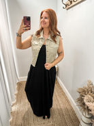 This khaki denim vest is a versatile staple for anyone’s closet! Pair with a long sleeve or a dress and it’s an outfit! Very stretchy and brand is Risen